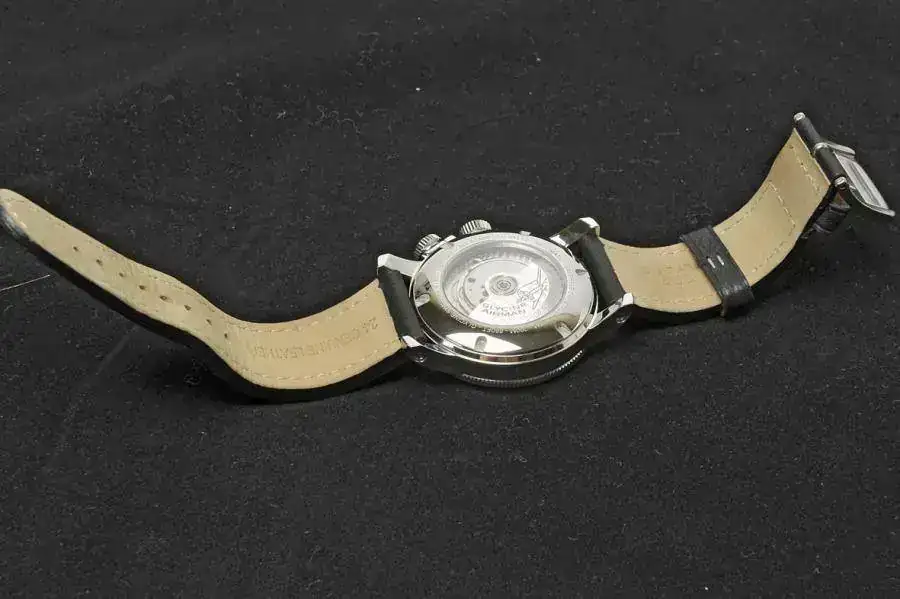 | Finish: | rhodium coated oscillating weight on ball bearing, decorated with "Côtes de Genève", GLYCINE crowns and is engraved by an airplane, bridges rhodium coated and decorated "perlé", visible screws in blue finish. | |