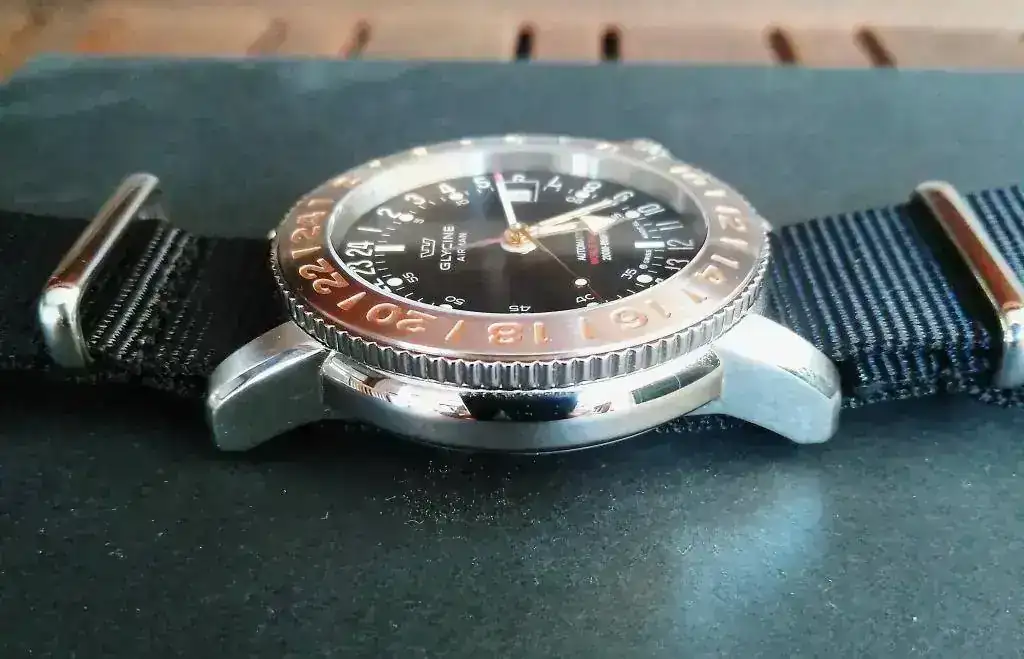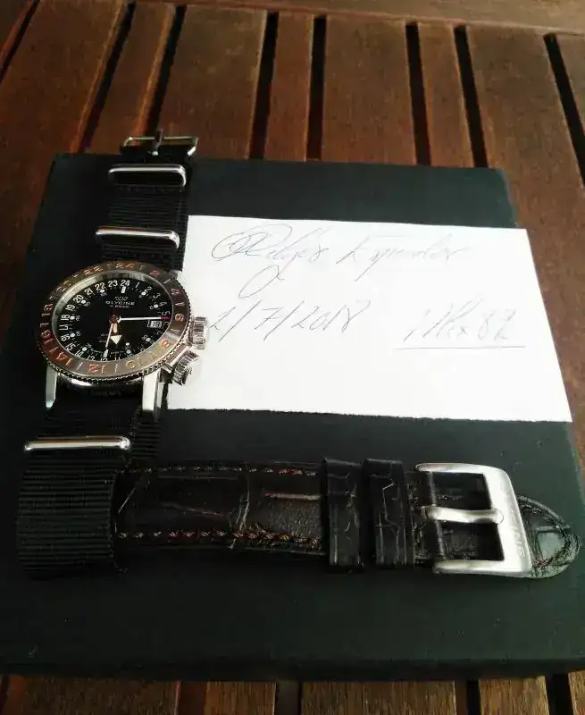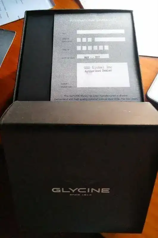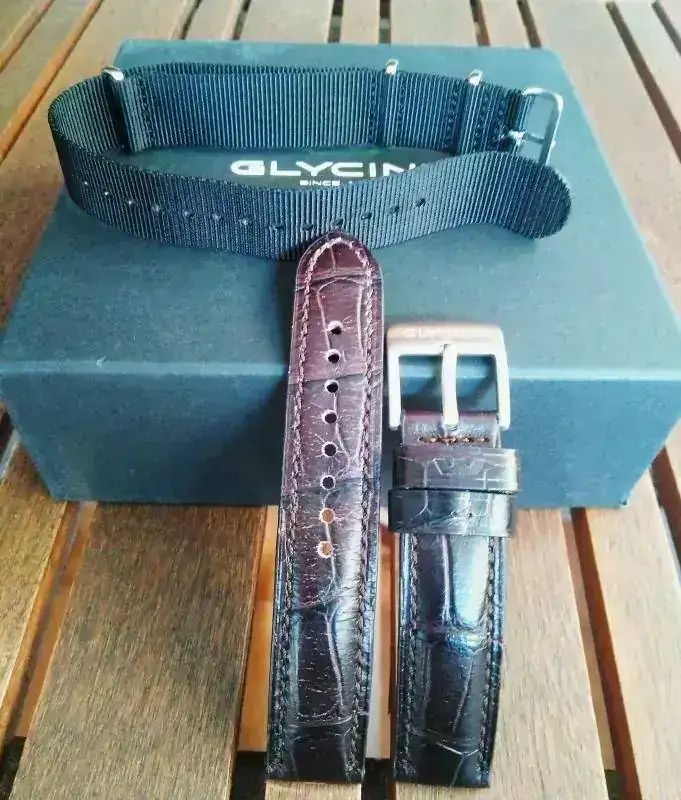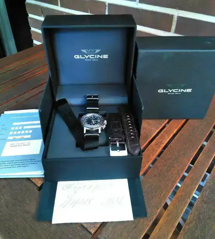 El reloj, adquirido por mí (he sido su único propietario) hace un año a través de Jomashop se entrega con toda su documentación, caja y papeles, una nato negra de regalo y la marrón de cuero original de Glycine. Como se ve en fotos se encuentra en un estado estupendo, ha sido usado pero muy poco, con su lumen en perfecto estado. La correa marrón original no me la he puesto nunca, la nato negra 2 o 3 veces, algún pelillo tiene del cambio de correas, inapreciable a simple vista pero lo tiene. Por reseñar algo, en la parte lateral donde no están las coronas tiene un pequeño pelillo, lo pongo por ser escrupuloso ya que el reloj está en un estado realmente bueno.