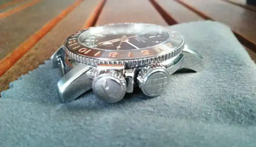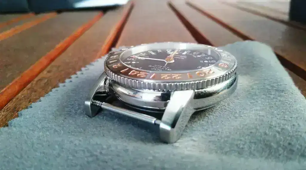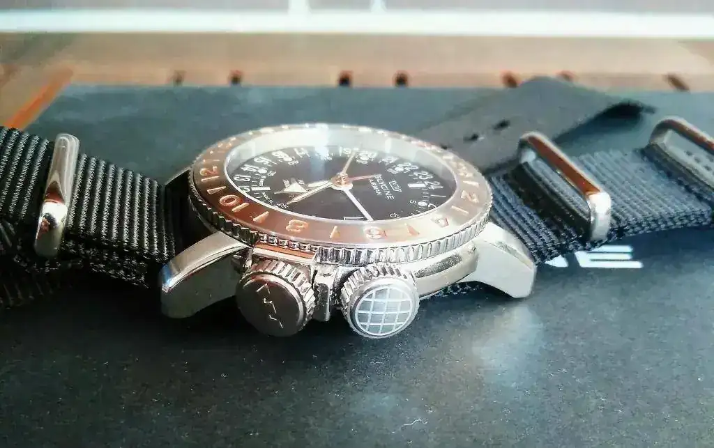 El Reloj corresponde a los airman de la época pre-invicta, con el escudo en el dial sin las alas, en mi opinión mucho más bonitos que los actuales. Aclarar que consta de 4 agujas, 3 que se corresponden con el movimiento más común de los relojes (horas, minutos y segundos), es decir, que la horaria pasa dos veces por las 12 y una cuarta (gmt) que barre el dial una sola vez al día. Estos serían los 2 husos horarios principales, el tercer huso horario corresponde al movimiento del bisel externo que se desbloquea con la corona situada a las 4 y que se calcula respecto de la aguja gmt de 24 horas.