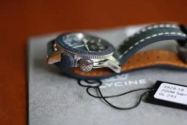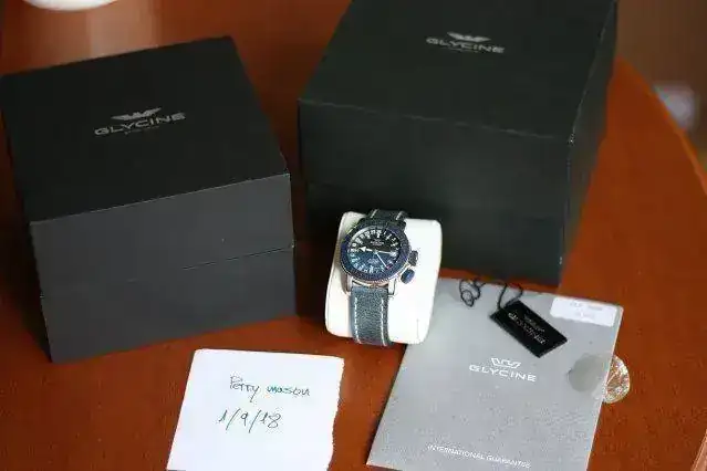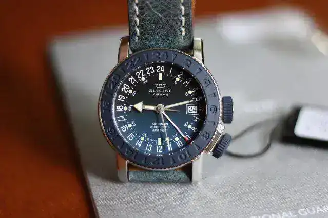 El modelo es el Glycine (pre-Invicta, como se puede ver en el logotipo), modelo 18, versión GMT, con el famoso fondo degradado azul día-noche, y en la edición limitada "Sphair" (bisel y coronas en caucho).