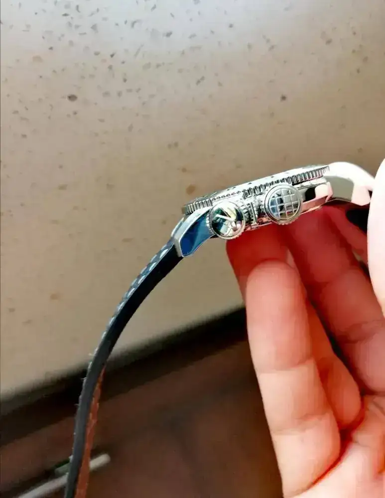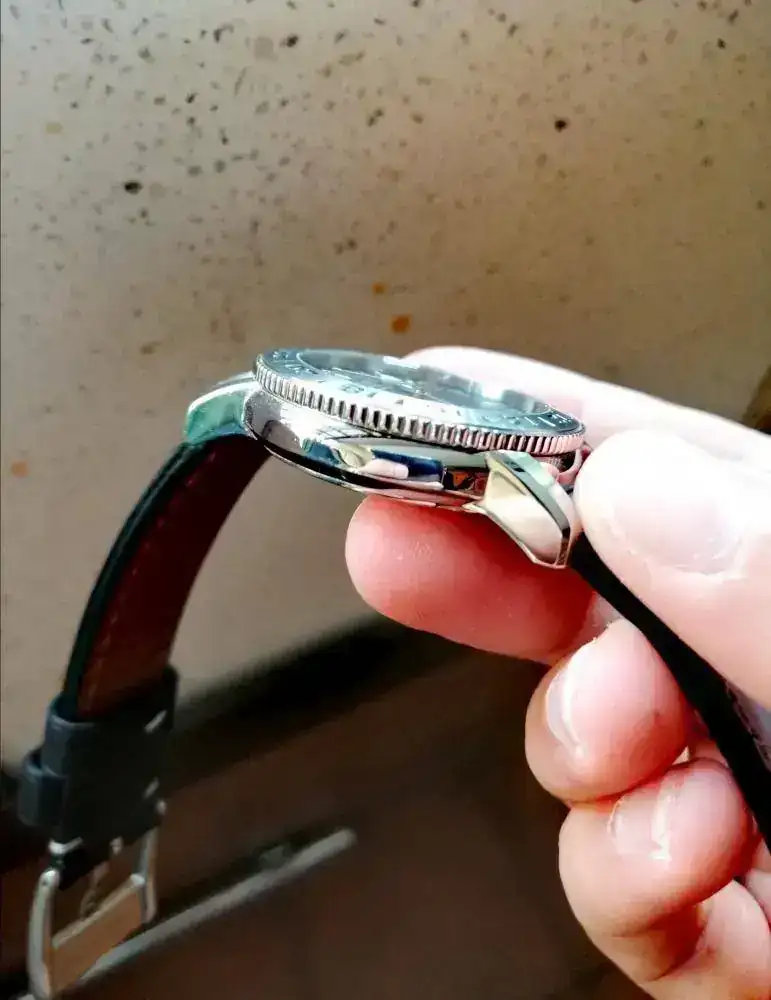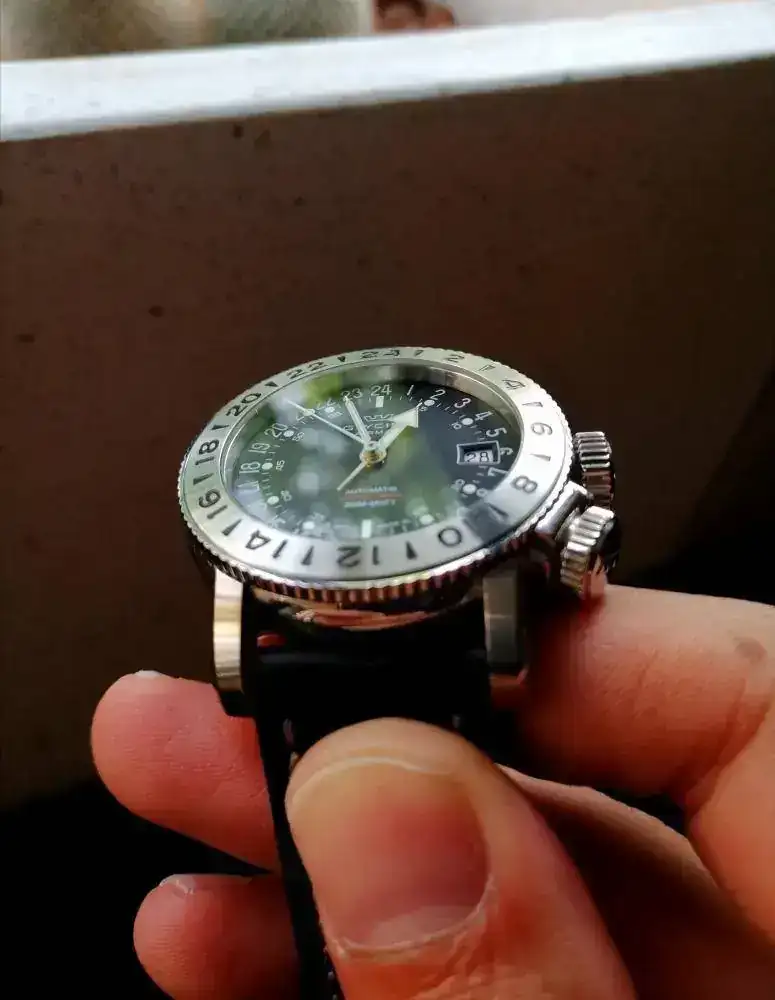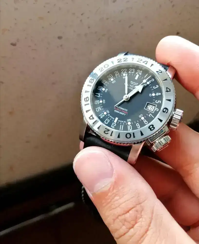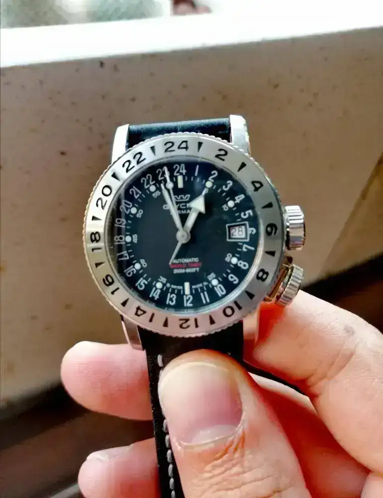 Adquirido por mí en octubre de 2018 se entrega con toda su documentación, caja y papeles, así como con su correa y hebilla original, la cual no ha tenido uso. La corona a rosca situada a las 3 se emplea para colocar el día en la segunda posición y la hora en la tercera. La corona situada a las 4 sirve para bloquear el bisel que hace de segunda zona horaria.