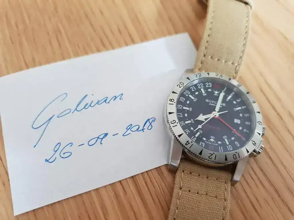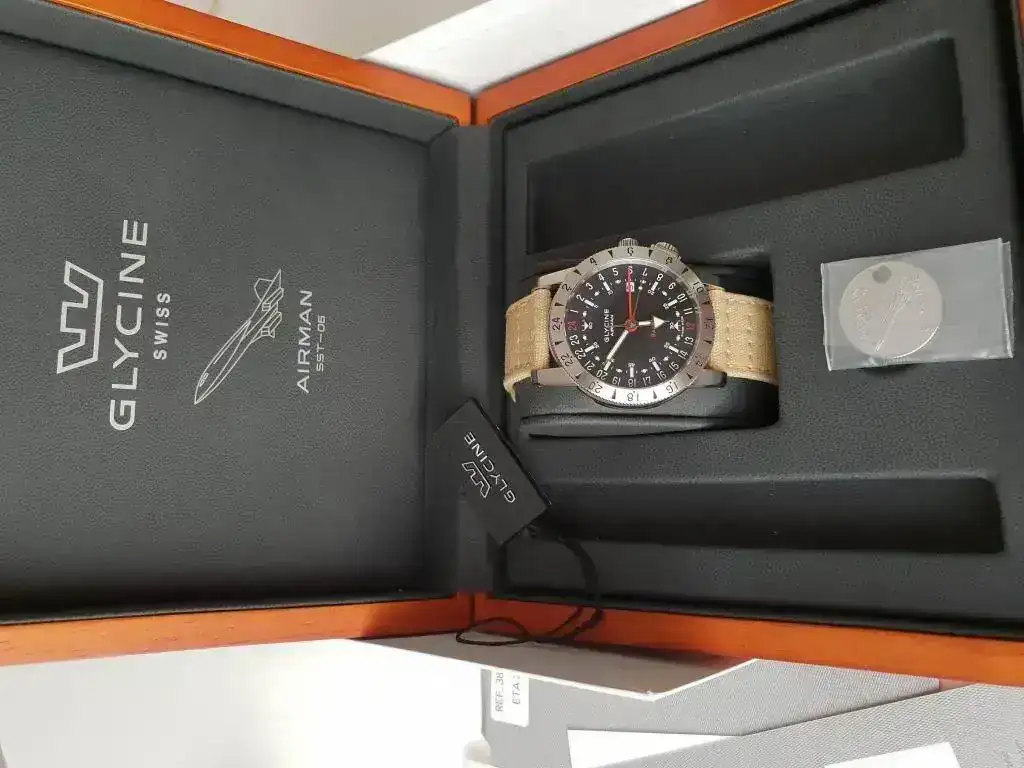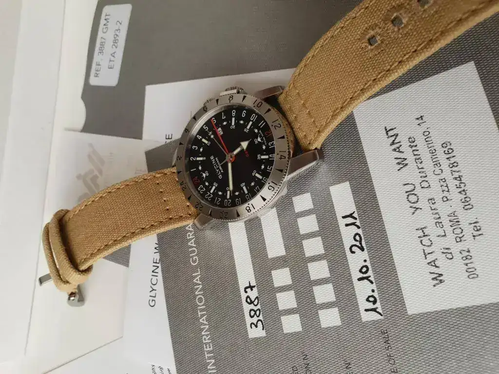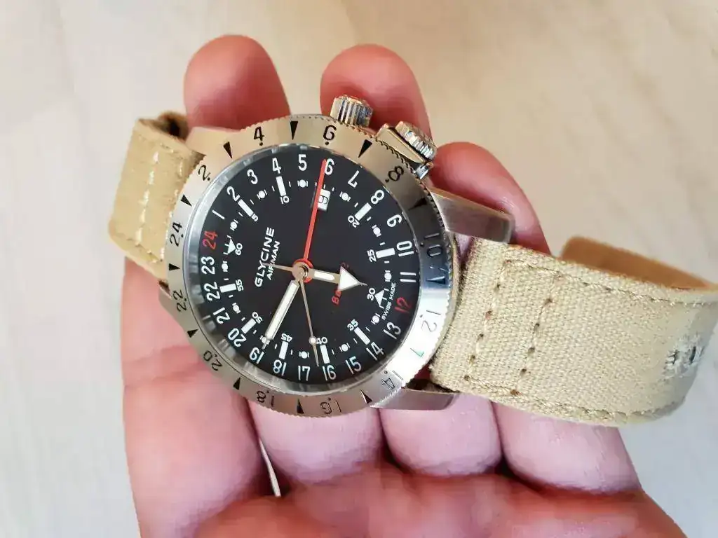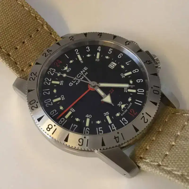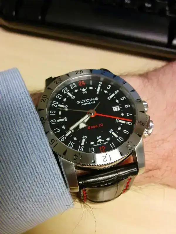 Saco a la venta un Glycine Airman Base 22 referencia 3887 GMT (pre-Invicta) en muy buen estado. La dotación la compone una correa de cocodrilo negra con pespunte rojo del artesano Jacob Straps con hebilla original Glycine y una correa canvas con cambio rápido de Barton Straps.
