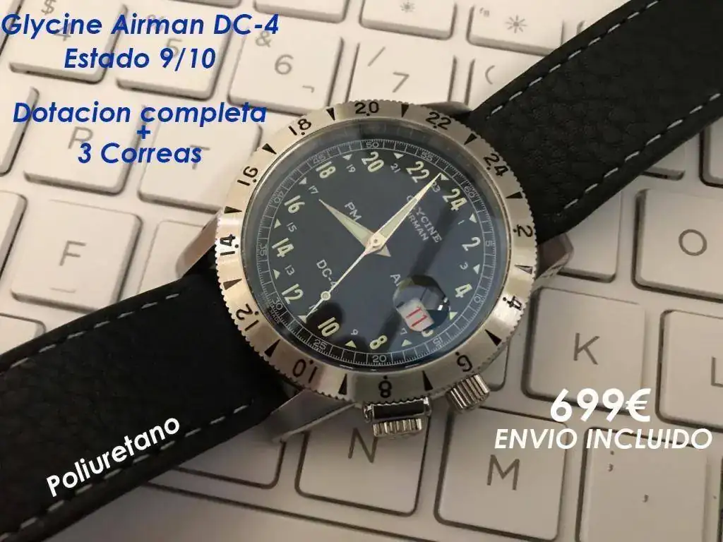 Hola a todos, saco este precioso Glycine Airman DC-4 versión purist (la buena jajja) de color negro, con esa preciosa lupa, esas agujas cepilladas y ese precioso zafiro. El estado es buenísimo, no le pongo 10 porque lo he usado, pero no tiene ni una marca a destacar, puede que algún pelillo en la zona pulida pero inapreciable vamos.