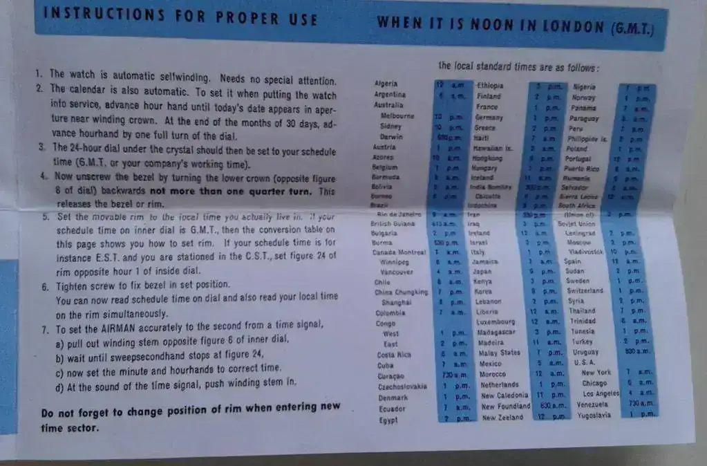 En el libro de instrucciones que se entregaba con el reloj, aparecían las zonas horarias de los principales países que se encontraban en rutas conectadas por vuelos
