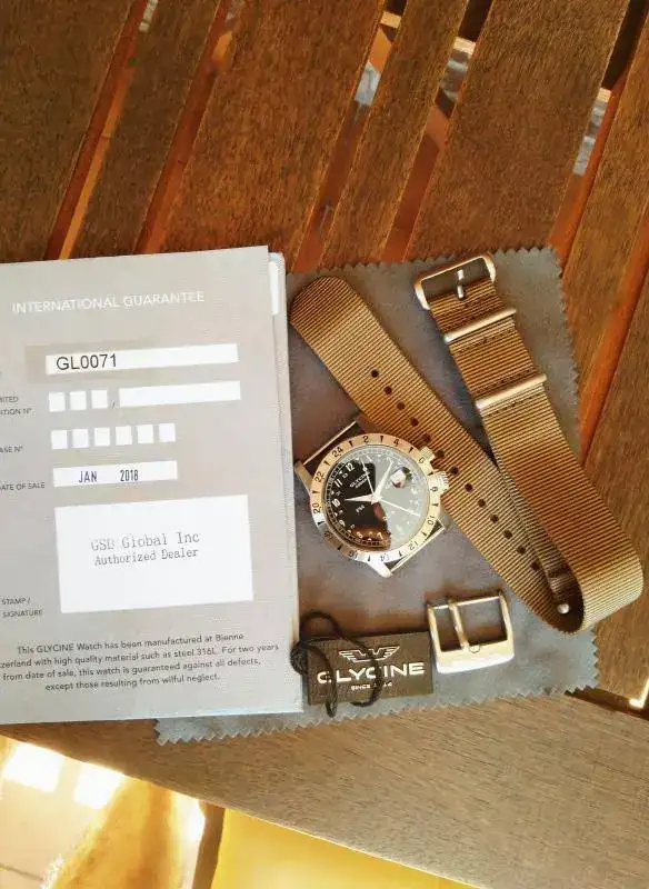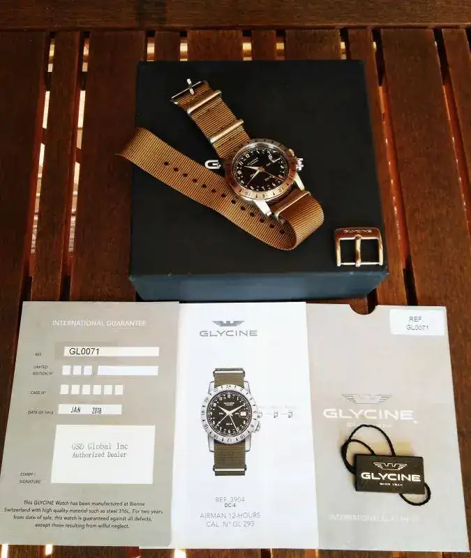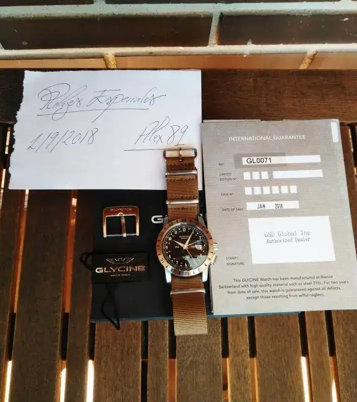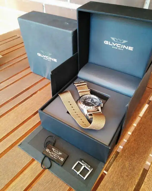 El reloj, como digo, procede de un cambio realizado en marzo de este mismo año. La fecha de compra es de enero de 2018. Se entrega con toda su documentación, caja y papeles y una nato beige khaki que no es la original pero con la hebilla y cierre originales de Glycine. Como se ve en fotos se encuentra en un estado estupendo, apenas lo he usado, con su lumen en perfecto estado. La correa nato con la que lo entrego no se ha usado, la compré porque creo que es la que mejor le queda al airman, algún pelillo tiene del cambio de correas en la cara interna de las asas, inapreciable a simple vista pero lo tiene.