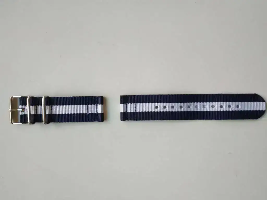 Se me olvidó comentar que también incluirÃ#a una correa nato de color azul marino y blanco hecha en dos piezas, tal como se puede observar en la foto.
