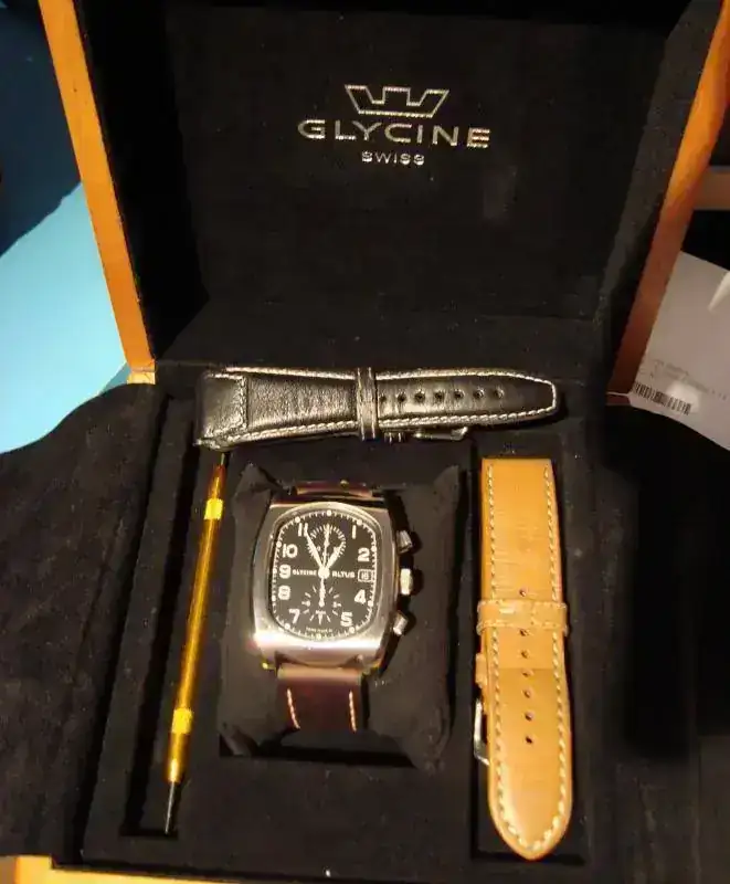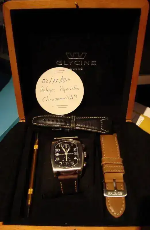 EL RELOJ LO ENTREGO CON SU CAJA DE MADERA, CAMBIA CORREAS ADEMAS DE TRES CORREAS: DOS ORIGINALES GLYCINE (UNA MARRÓN OSCURO ENVEJECIDA LA CUAL ESTA COMO NUEVA YA QUE TIENE DOS PUESTAS Y LA OTRA ORIGINAL COLOR MARRÓN CLARO CON USO PERO TOTALMENTE OPERATIVA) Y UNA TERCERA CORREA TAMBIÉN COMO NUEVA CON CUATRO PUESTAS DE COLOR NEGRO CON PESPUNTES BLANCOS NO ORIGINAL.