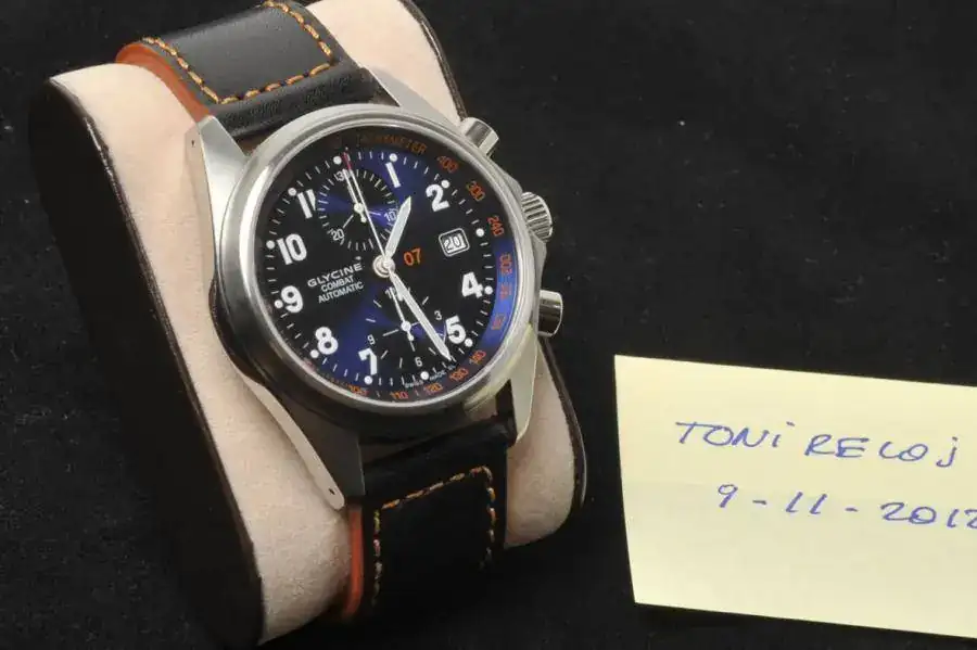 Vendo este espectacular Glycine Combat 07 con esfera azul que lo hace muy especial combinado con los números naranja y correa a juego. Esta prácticamente nuevo ya que no ha tenido uso. Reloj del 2009 y se entrega con las dos cajas originales y una correa original negra con pespuntes blanco a estrenar ( de hecho como la naranja que solo tiene la curva de estar en la caja )