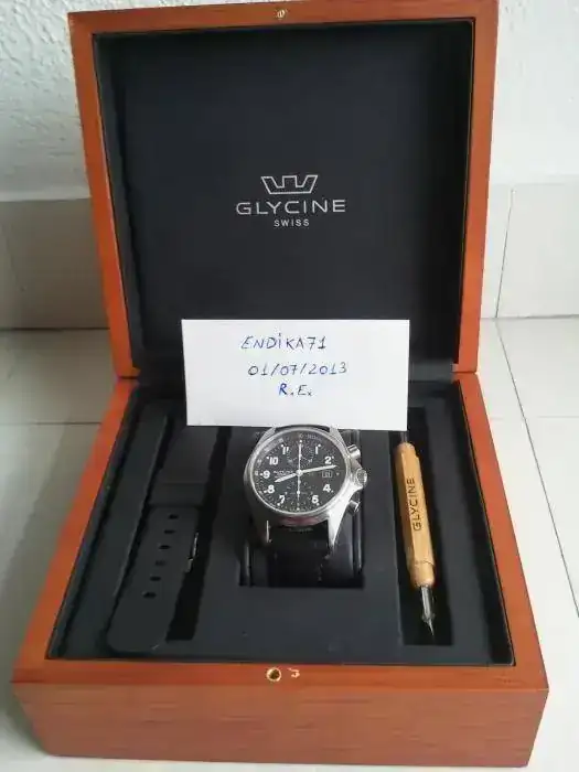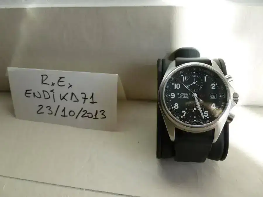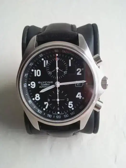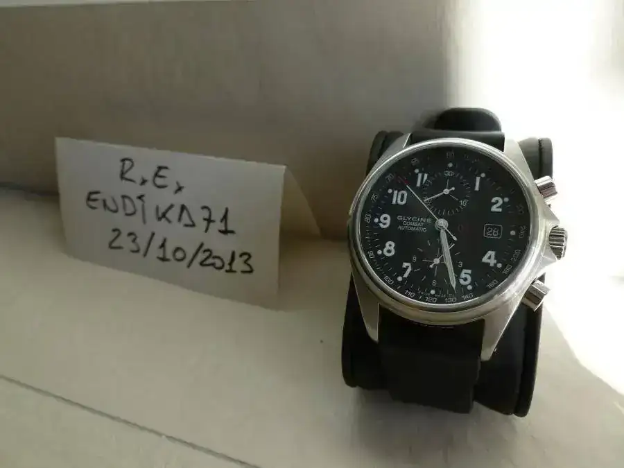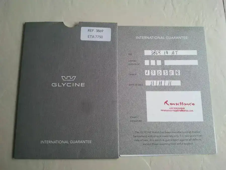 Lo entrego con una correa de piel original Glycine con deployante y otra de caucho no original pero exactamente igual que la original sin el logo, de muy buena calidad, gruesa y con agradable olor a vainilla. Ambas correas han tenido poquísimo uso. Están prácticamente nuevas como se puede observar en las fotos.