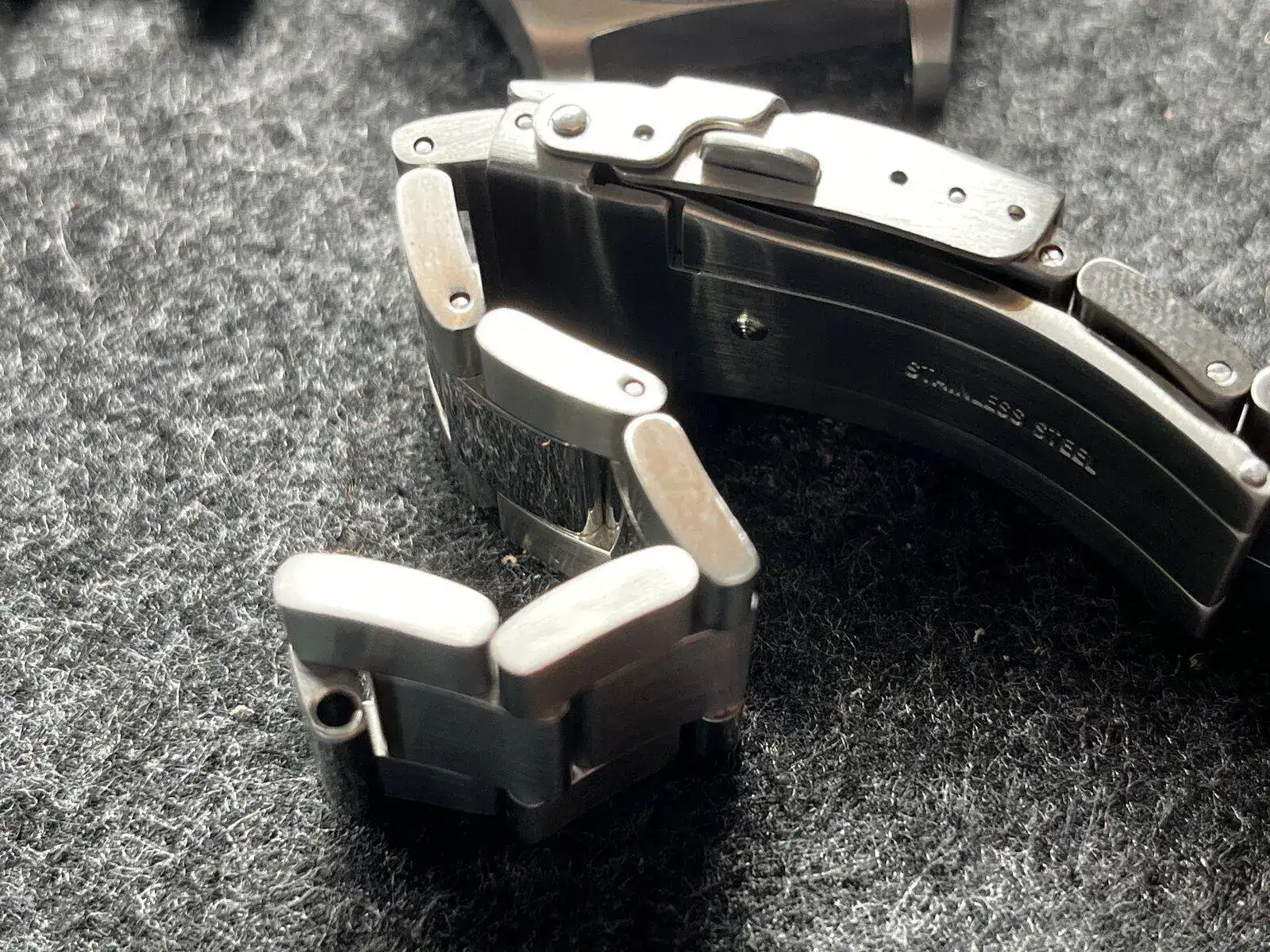 En cuanto al armis creo que un acabado cepillado hubiese sido más acertado, los eslabones son macizos, están bien aunque sus aristas sin ser molestas se hacen notar, el cierre también es mejorable, en conclusión el brazalete para mi gusto, le resta al conjunto, lo calificaría como aceptable.