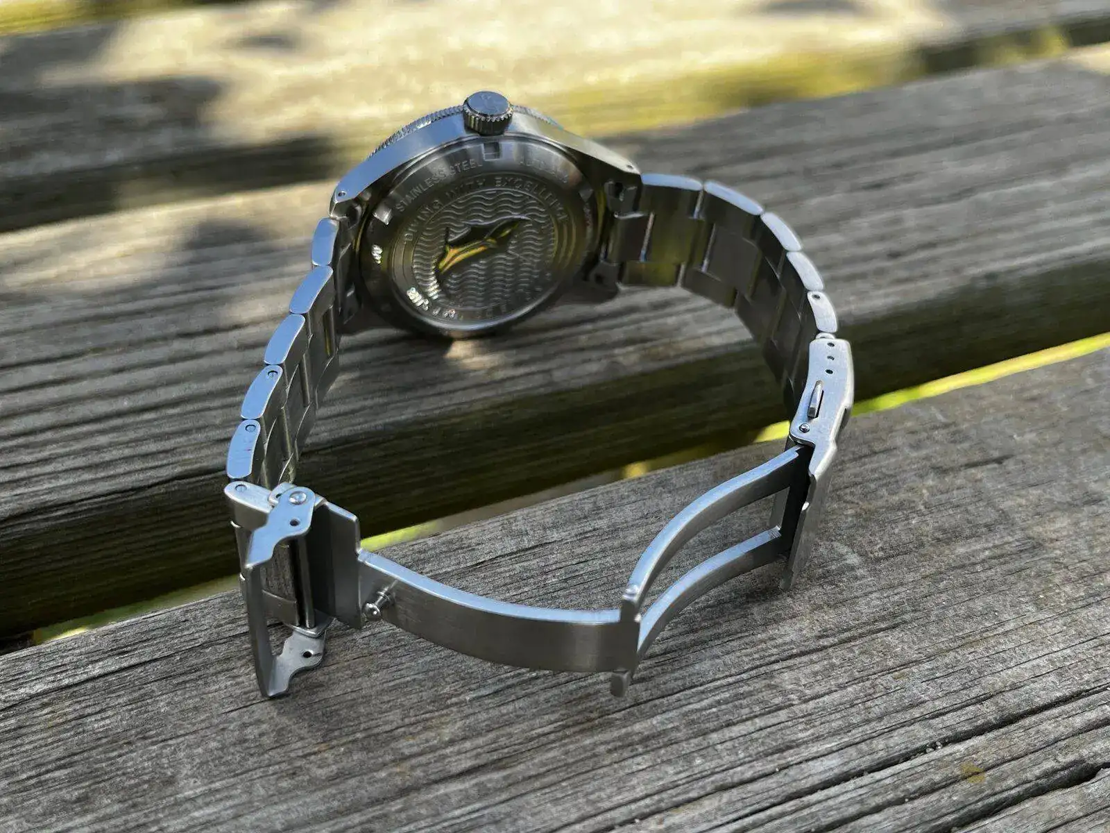 La primera sensación en la mano es de ser un reloj robusto, con un peso correcto, no se siente pesado ni demasiado liviano, unos 150 gramos con armis, el color de la esfera de efecto sunburst se ve mas bien mate, produciendo este efecto solamente al sol: