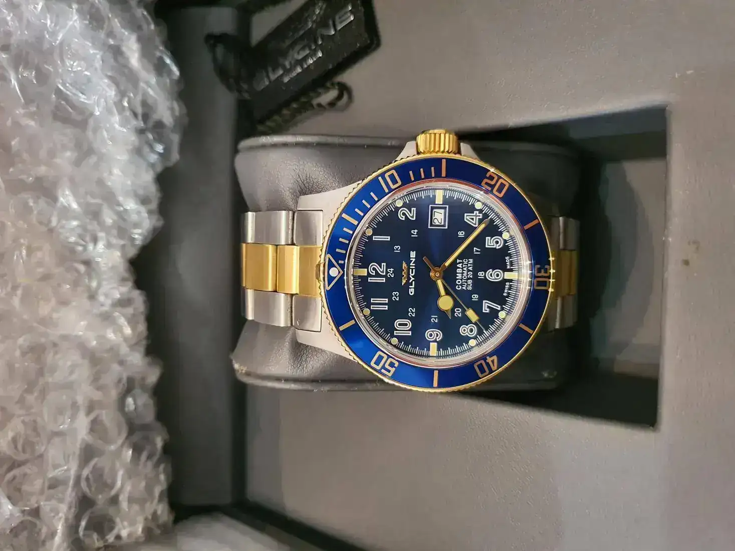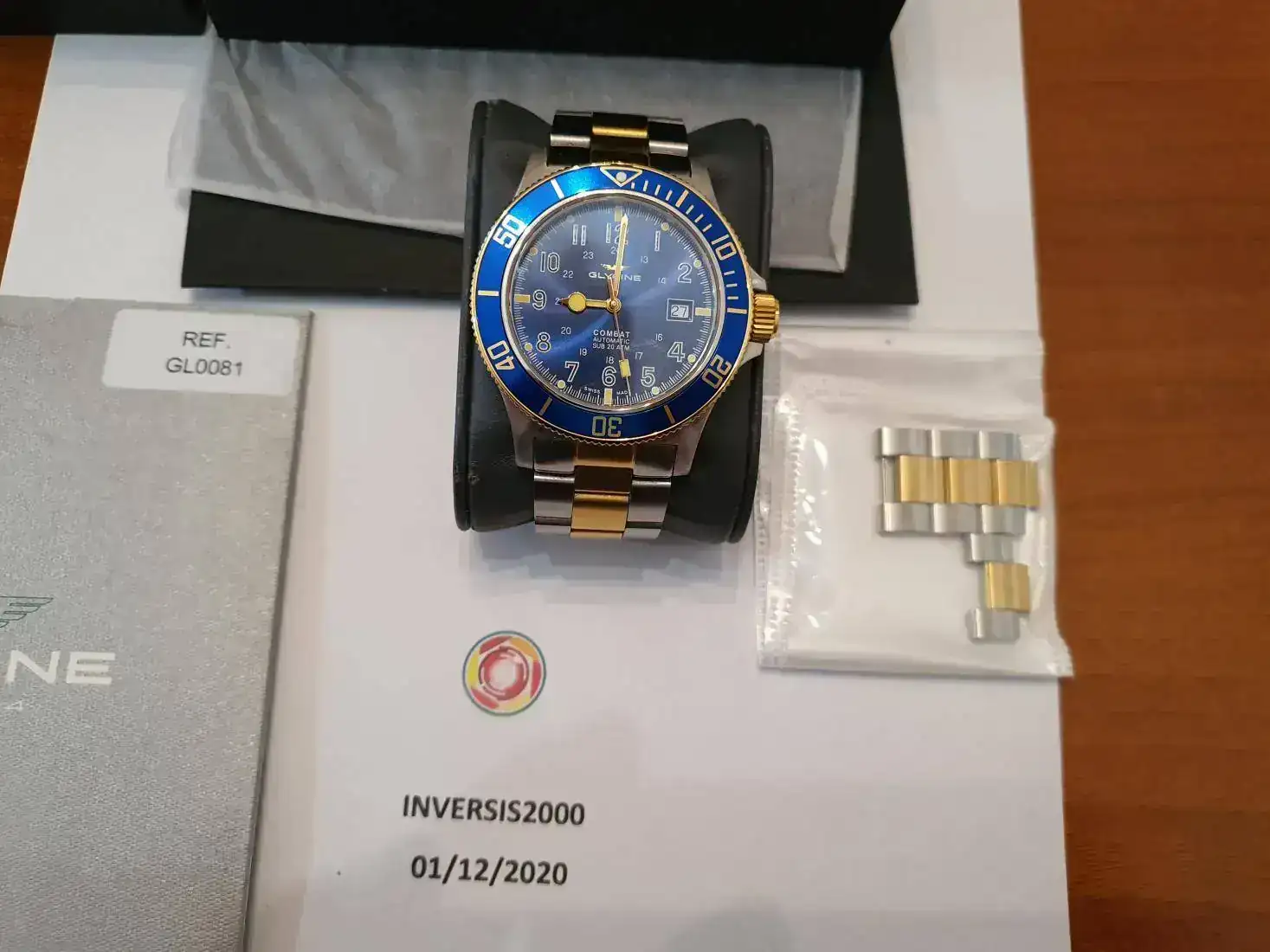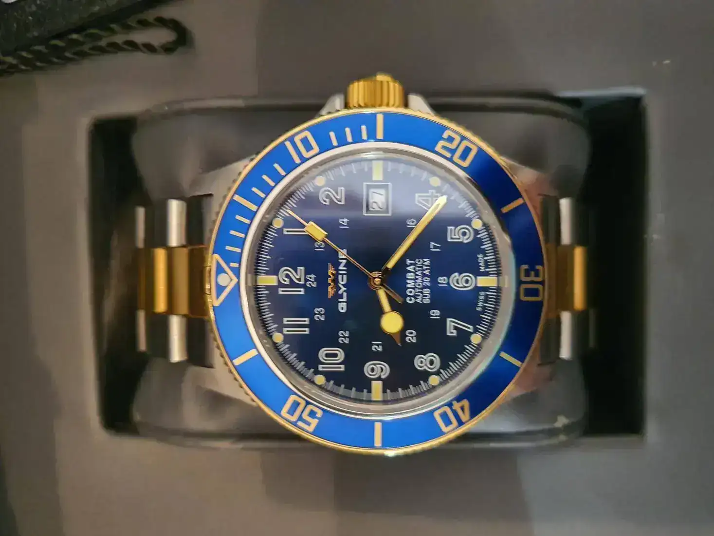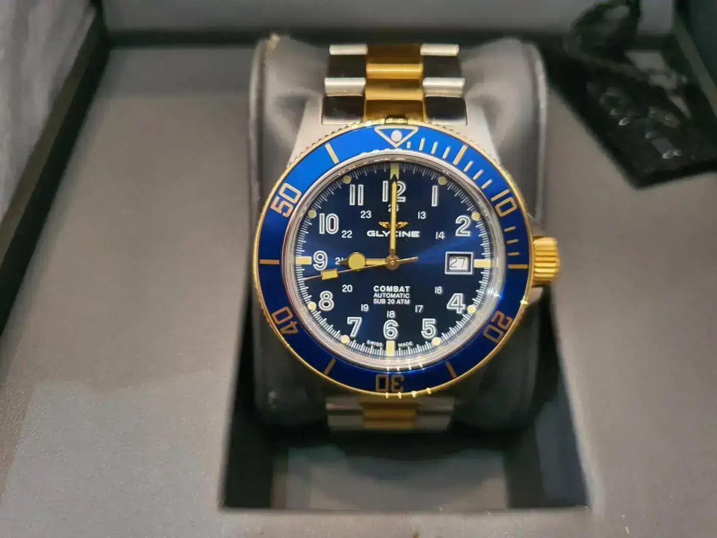 En esta ocasión pongo a la venta una bonita pieza, concretamente un GLYCINE COMBAT SUB, dial azul electrico y brazalete de acero y oro (me refiero a color dorado), modelo GL0081. El reloj se encuentra en un estado excepcional, casi de reestreno (9/10), debido a que lo he utilizado muy poco, ya sabeis lo que pasa, se carga uno de piezas y se va rotando de piezas continuamente. Le aprecio las típicas y muy pocas microrayas en el cierre del brazalete de apoyar sobre la mesa, nada más que destacar. Funcionamiento del reloj correcto.