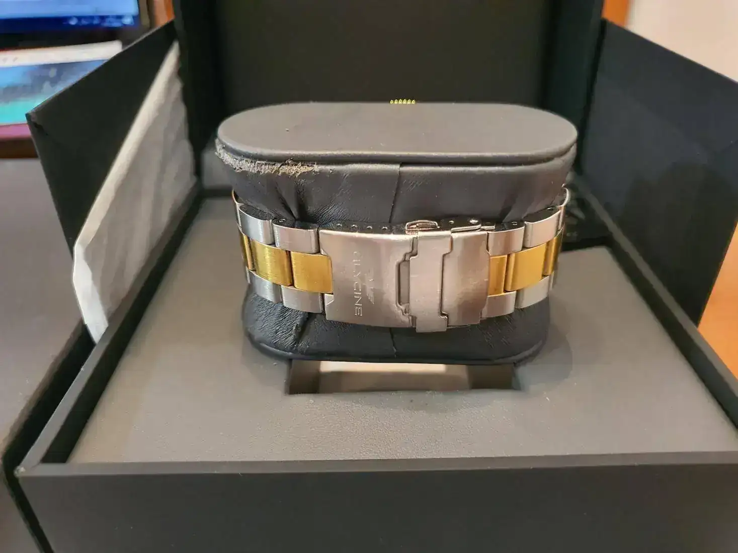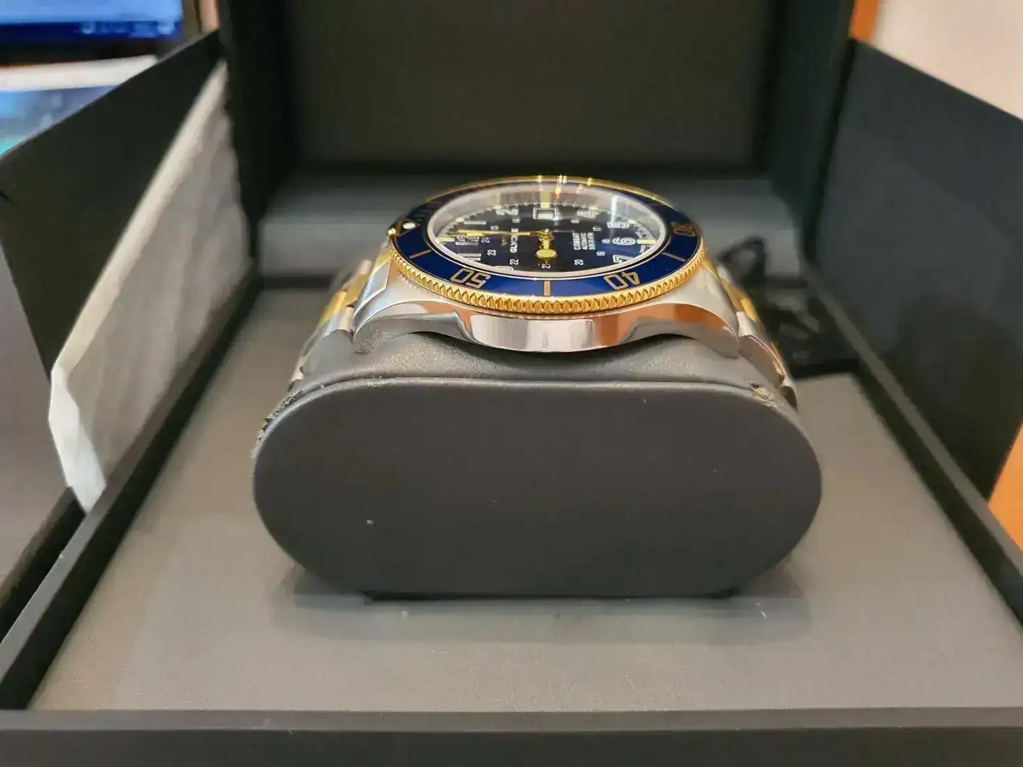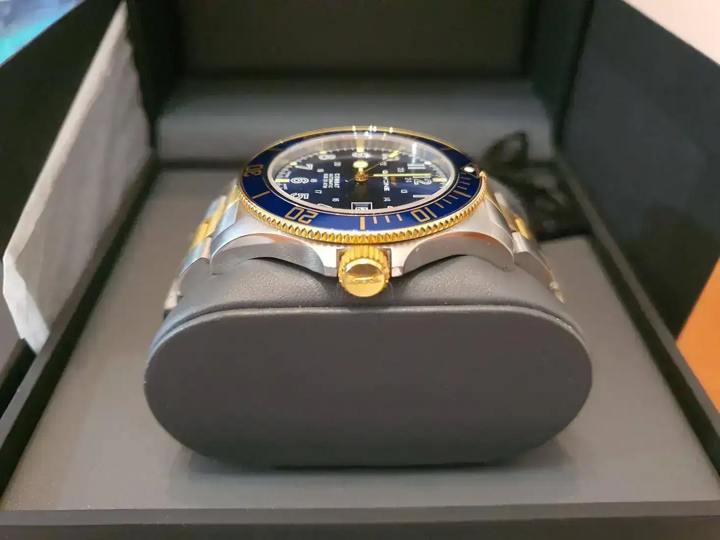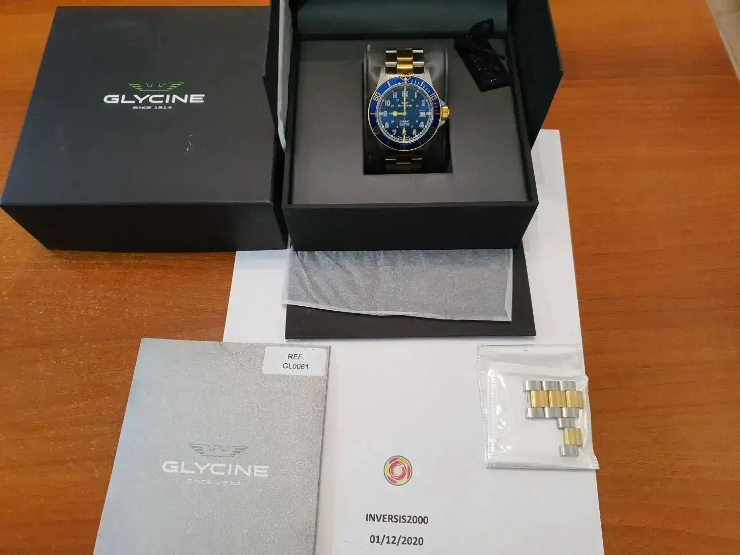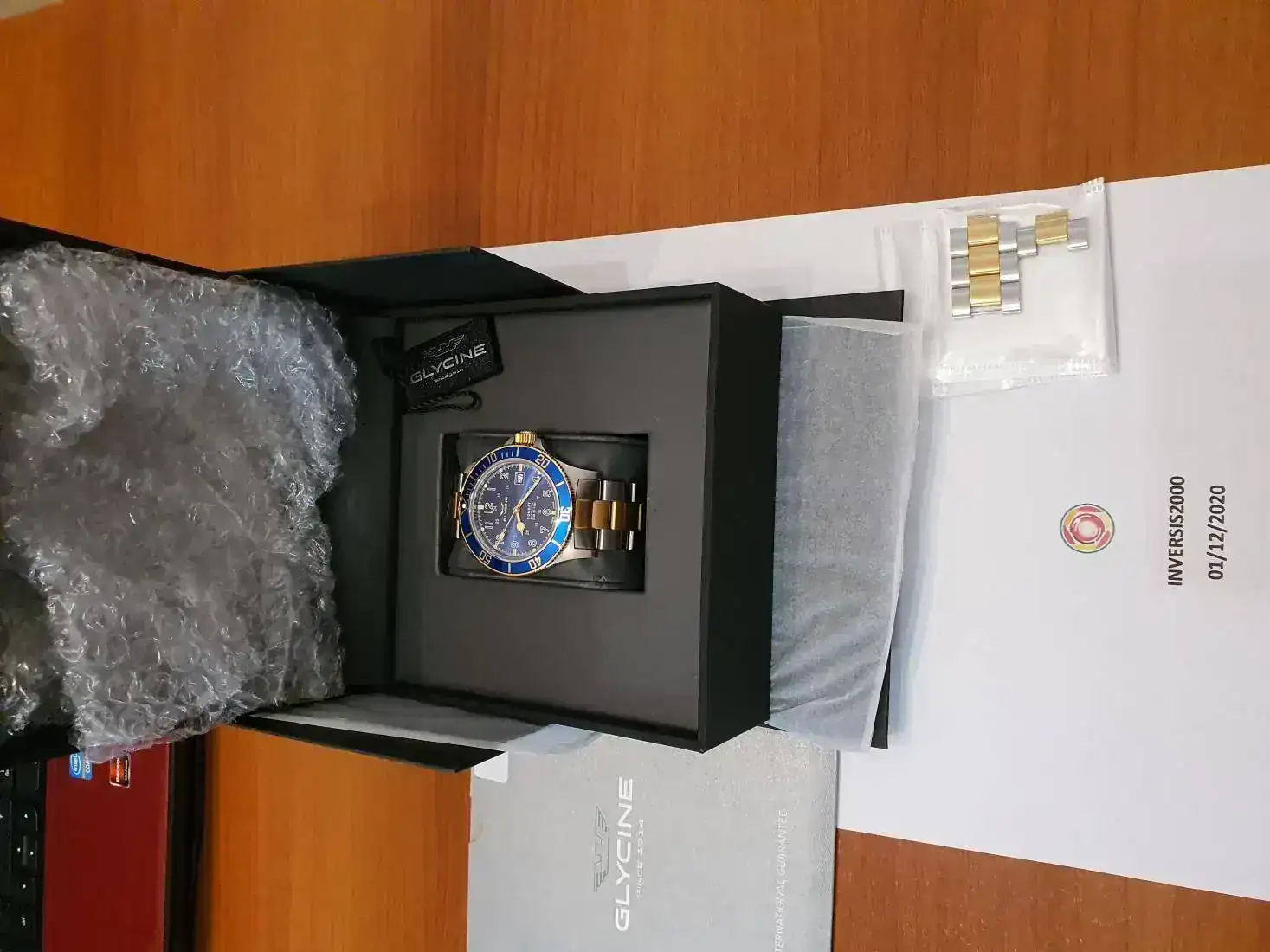 En esta ocasión pongo a la venta una bonita pieza, concretamente un GLYCINE COMBAT SUB, dial azul electrico y brazalete de acero y oro (me refiero a color dorado), modelo GL0081. El reloj se encuentra en un estado excepcional, casi de reestreno (9/10), debido a que lo he utilizado muy poco, ya sabeis lo que pasa, se carga uno de piezas y se va rotando de piezas continuamente. Le aprecio las típicas y muy pocas microrayas en el cierre del brazalete de apoyar sobre la mesa, nada más que destacar. Funcionamiento del reloj correcto.