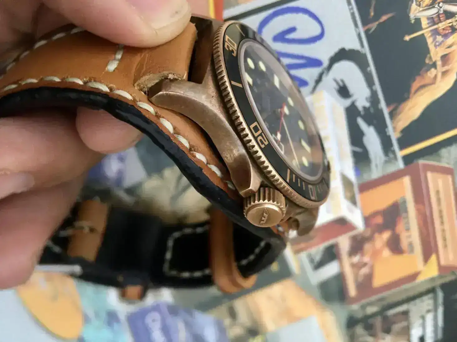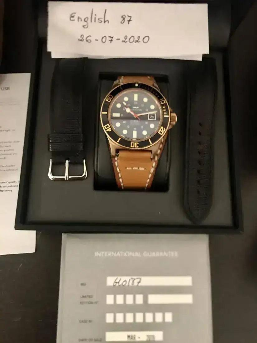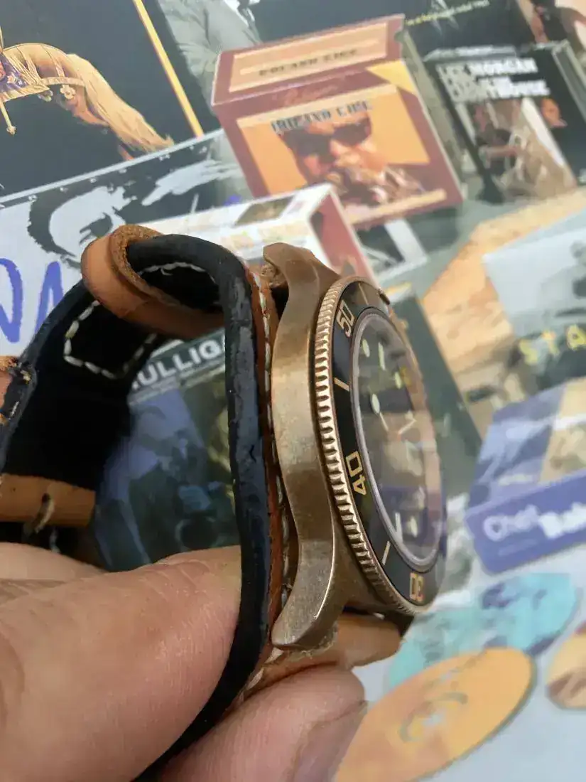 Le sienta bien correas de cuero envejecido, natos o su propia correa original de color negro. Últimamente lo llevo con una Bound que se pagaría aparte en caso de interesar.