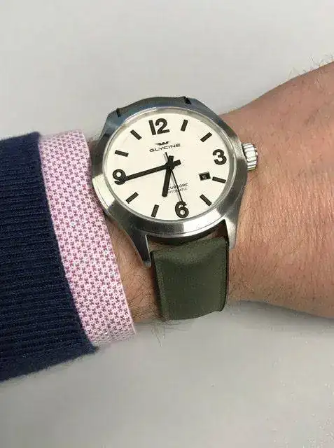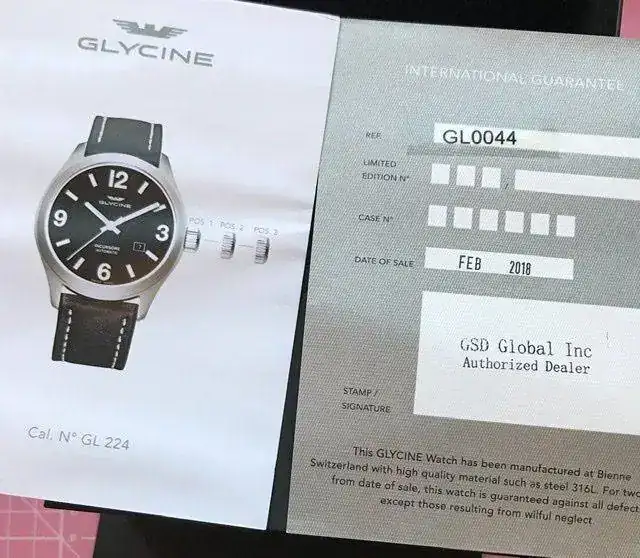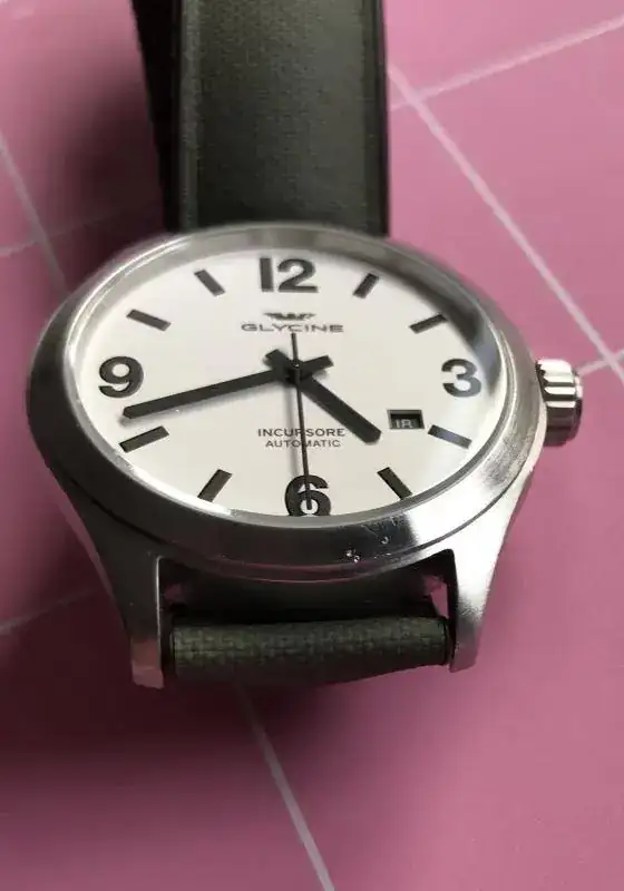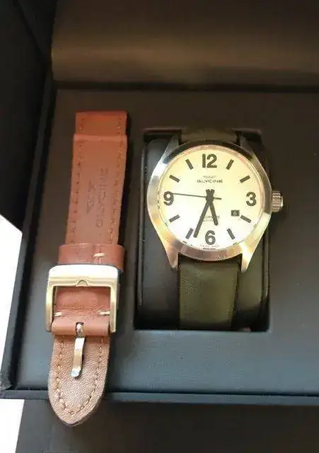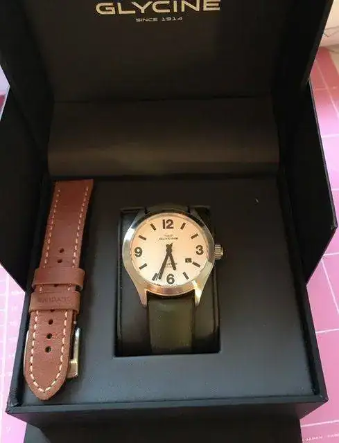 Glycine Incursore de 44 mm, automático en perfecto estado y aún en garantía, sellada en 2018. Se entrega con dotación completa: caja , documentación y pulsera de piel original sin estrenar, además la que lleva en la foto de regalo, una hirsch de piel tratada como si fuera caucho que le sienta espectacular.