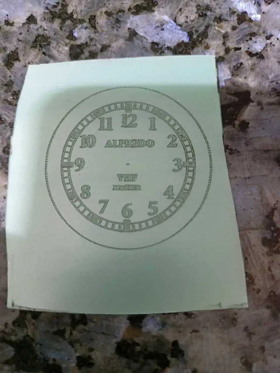 Tengo un dial de plástico translúcido el cual quiero grabar con mi marca a laser. Debido a mi otra afición, el airsoft, se que el laser sobre polímero queda como quemado pero bastante guay, y es algo que se puede hacer.