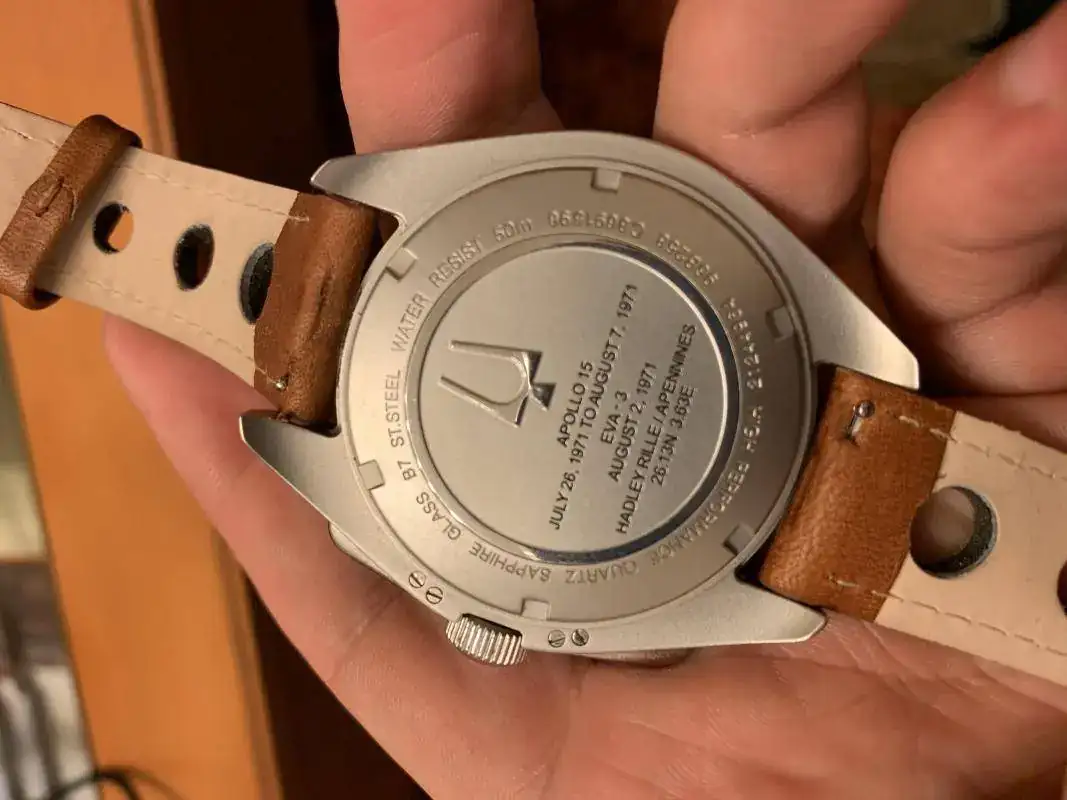 y aquí el conocido Bulova Lunar Pilot con la EVA 3 del Apolo 15 en 1971.