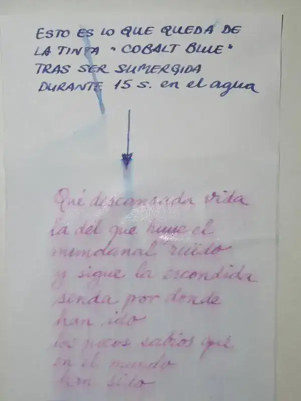 La permanencia (al menos la resistencia al agua) es el punto débil de esta tinta. Si observáis una de las fotos, veréis que a los pocos segundos de sumergido en el agua (o incluso si le cae una gota), de lo que hemos escrito apenas queda un desvaído y tenue eco rosáceo. Por tanto, no es apta para escribir sin paraguas bajo la lluvia o en la ducha (yo no suelo escribir en tales circunstancias, pero como hay gente pa tó, avisados estáis). No he hecho pruebas de resistencia a la luz, pero me da la sensación de que tampoco resistiría un par de días de agosto en Murcia a pleno sol a casi 40º. Ya os diré algo cuando llegue el verano.