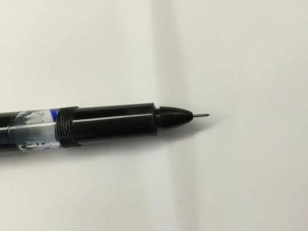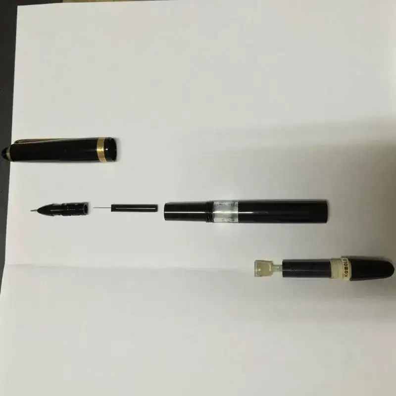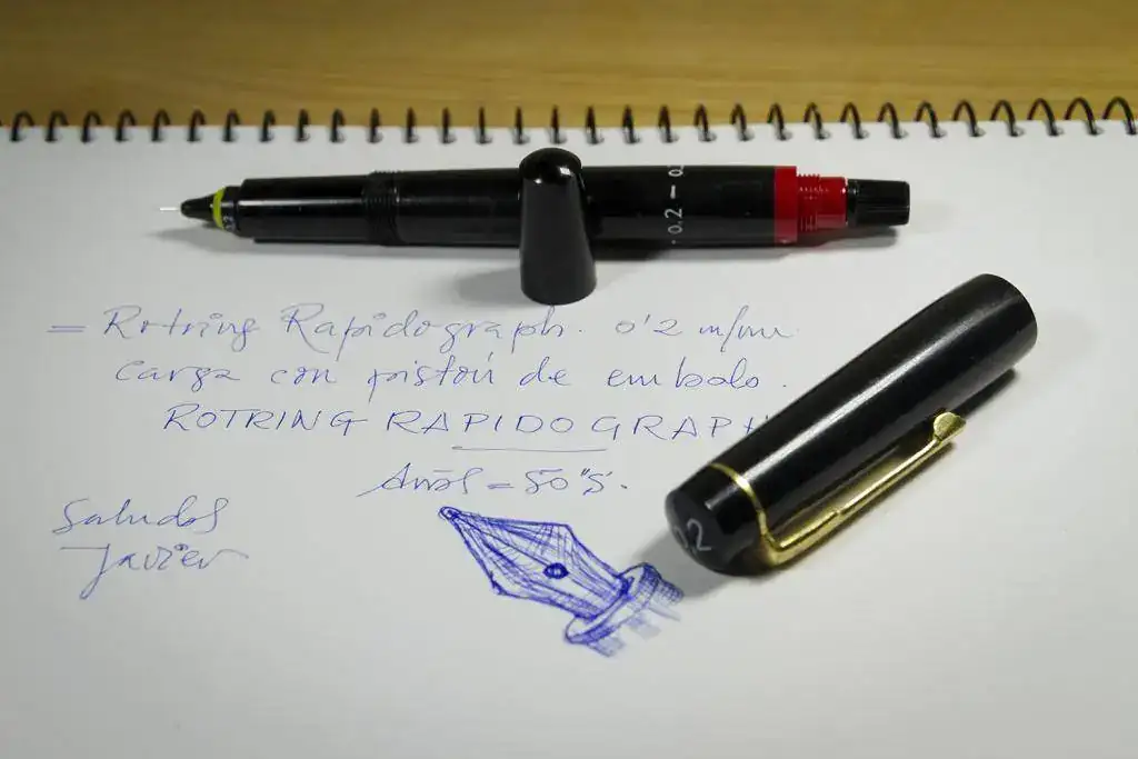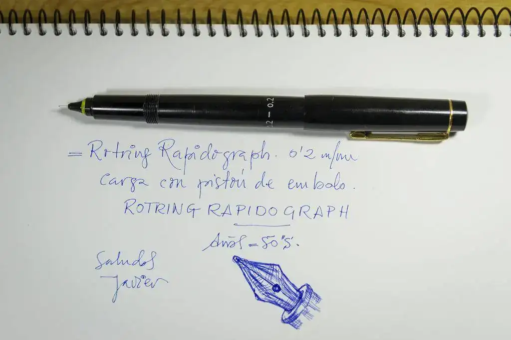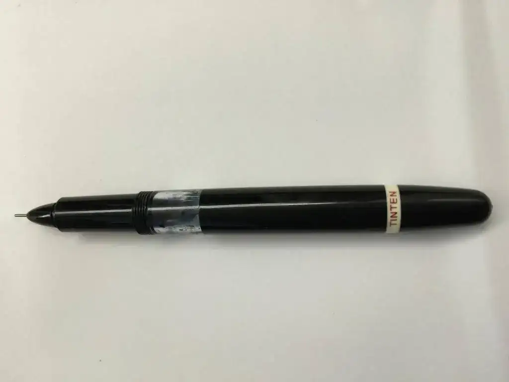El plumín (si es que se le puede llamar así) es como un "grafo-rotring". Es decir: es un cilindro hueco y en su interior hay una varilla muy fina que acaba en un trozo de ¿baquelita???. Cuando se apoya la punta en el papel empieza a salir la tinta.
