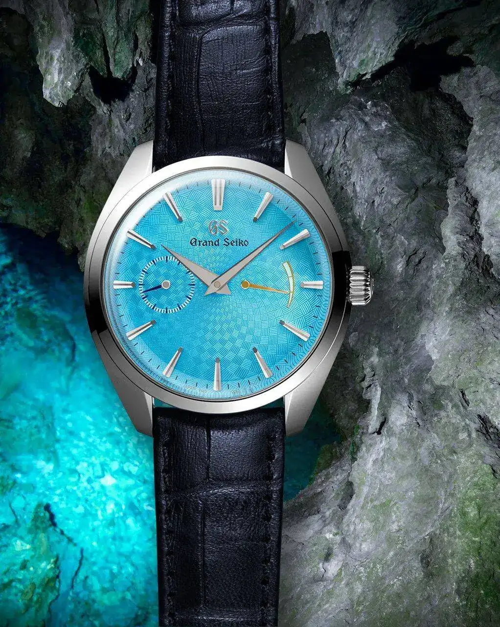 La esfera del SBGK015 está inspirada en los lagos subterráneos azul intenso y verde esmeralda de Ryusendo. Ubicada en Iwaizumi, en el este de la prefectura de Iwate, la cueva Ryusendo presenta amplias galerías subterráneas que se arquean sobre profundos lagos sin sol llenos de agua azul clara.
