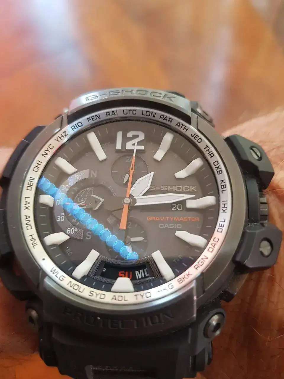 Otro detalle para mi muy importante es que en su pantalla el Dial giratorio en el GPW-2000 muestra "Dia de la Semana + Funcion activa + Longitud y Latitud de Coordenadas y No lo hace el MR-G G2000 que se conforma con otra Ventana movil donde tenemos las Zonas horarias solamente.