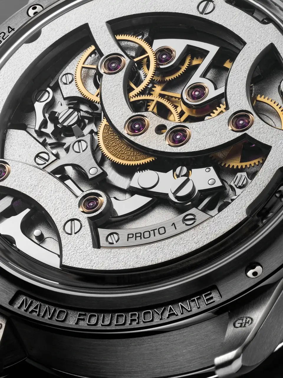 Para demostrar la viabilidad de la nano mecánica, Greubel Forsey ha reinventado el segundo foudroyante. Su aguja completa una revolución por segundo, dividiéndolo en segmentos según la frecuencia del movimiento. En este Nano Foudroyante, cada oscilación del volante de 3Hz produce dos latidos, totalizando seis latidos por segundo, lo que permite que la aguja divida el segundo en seis segmentos. Esta es una complicación que consume energía por naturaleza. Sin embargo, Greubel Forsey ha repensado radicalmente su diseño y construcción para gestionarla a nivel de nanojulio. En comparación con un foudroyante tradicional que consume 30µJ (microjulios) por salto, la Nano Foudroyante opera con solo 16nJ (nanojulios) por salto, reduciendo el consumo de energía en un factor de 1.800, lo que permite reducir el volumen del mecanismo en un 90%. Aquí, el objetivo no es solo medir fracciones de segundo, sino también servir como prueba de concepto para un enfoque completamente nuevo de la relojería. Con 428 componentes, el movimiento no mide más de 31mm de diámetro dentro de una caja de 37,9mm (la más pequeña jamás construida por Greubel Forsey).