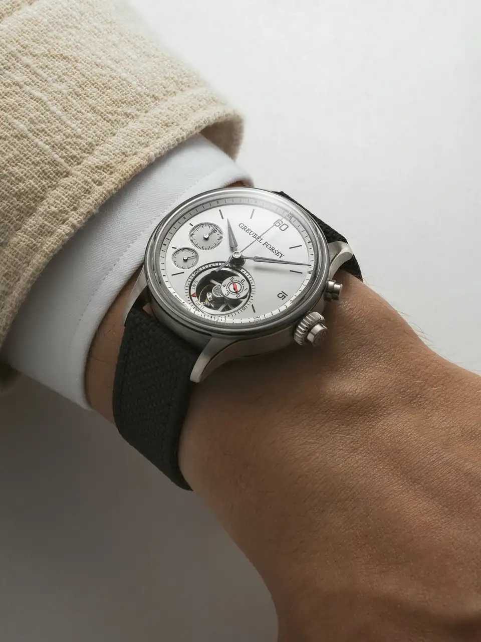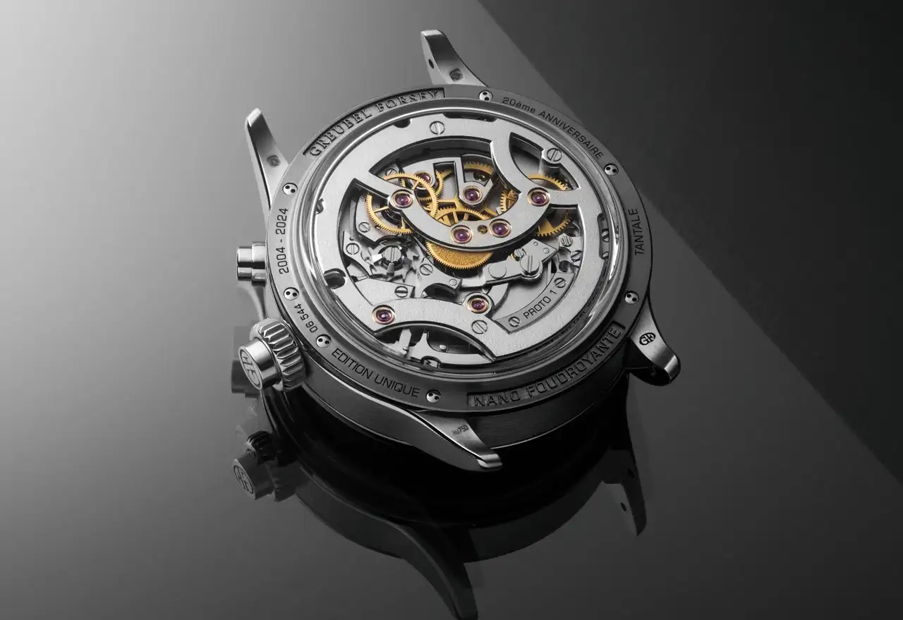 El Atelier también conserva sus firmas estéticas esenciales, incluidos los grabados en relieve pulidos de "Nano Foudroyante" y "Greubel Forsey" sobre un fondo martillado a mano, el oro blanco satinado a mano y un movimiento altamente arquitectónico.