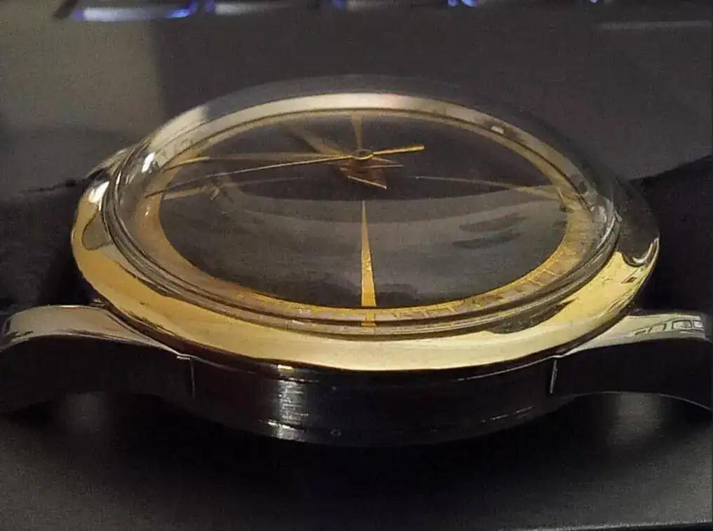 Caja de acero con fondo a presión con junta, mide 34mm, típico de aquella época. Lo mas raro es el doble bisel, tiene bisel de acero para el plexi y encima lleva otro bisel de oro 2N (muy amarillo muy blanco). Se puede llevar el reloj sin o con el bisel de oro. Cuando miramos a los Omega con Goldcap, el oro está laminado al acero y no se puede quitar. En general se puede decir que la caja es de calidad y macizo.