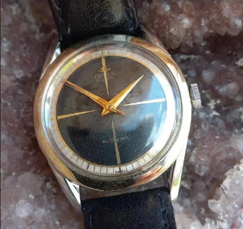 La esfera está en estado original y lleva el símbolo de marca en oro GW aplicado, firmado GRUEN GENEVE y AUTOWIND. El centro es negro con un reticulo dorado y la minuteria dorada tipo ferrocarri, seperado por un anillo dorado en juego con el bisel de oro, precioso.