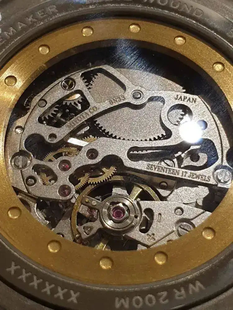 Lo que sigue teniendo es corona roscada, mecanismo manual, fondo visto, esfera sándwich, lumen cachondo, agujas doradas, zafiro curvo y trae una correa que es pura mantequilla en estado de reestreno.