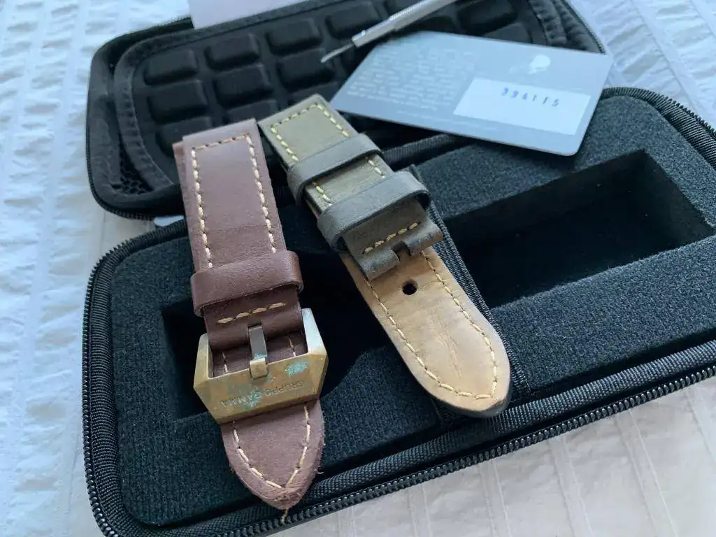 Correas: 2 piel , 1 caucho , 2 hebillas de bronce.
