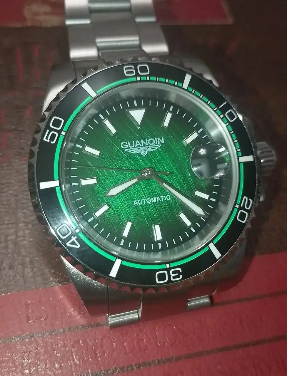 Buenos días! Saco a la venta este precioso Guanqin con la archiconocida NH35 de Seiko. Es un reloj que no pasa desapercibido por esa preciosa esfera de color verde. En algún sitio tengo que tener la caja y los papeles, aunque no sirvan de nada, yo los envío si los encuentro. Los acabados son de muy alta calidad. Los que conocéis la marca sabéis que está firma no defrauda en absoluto.Pido por él 65 euros con envío certificado a península.