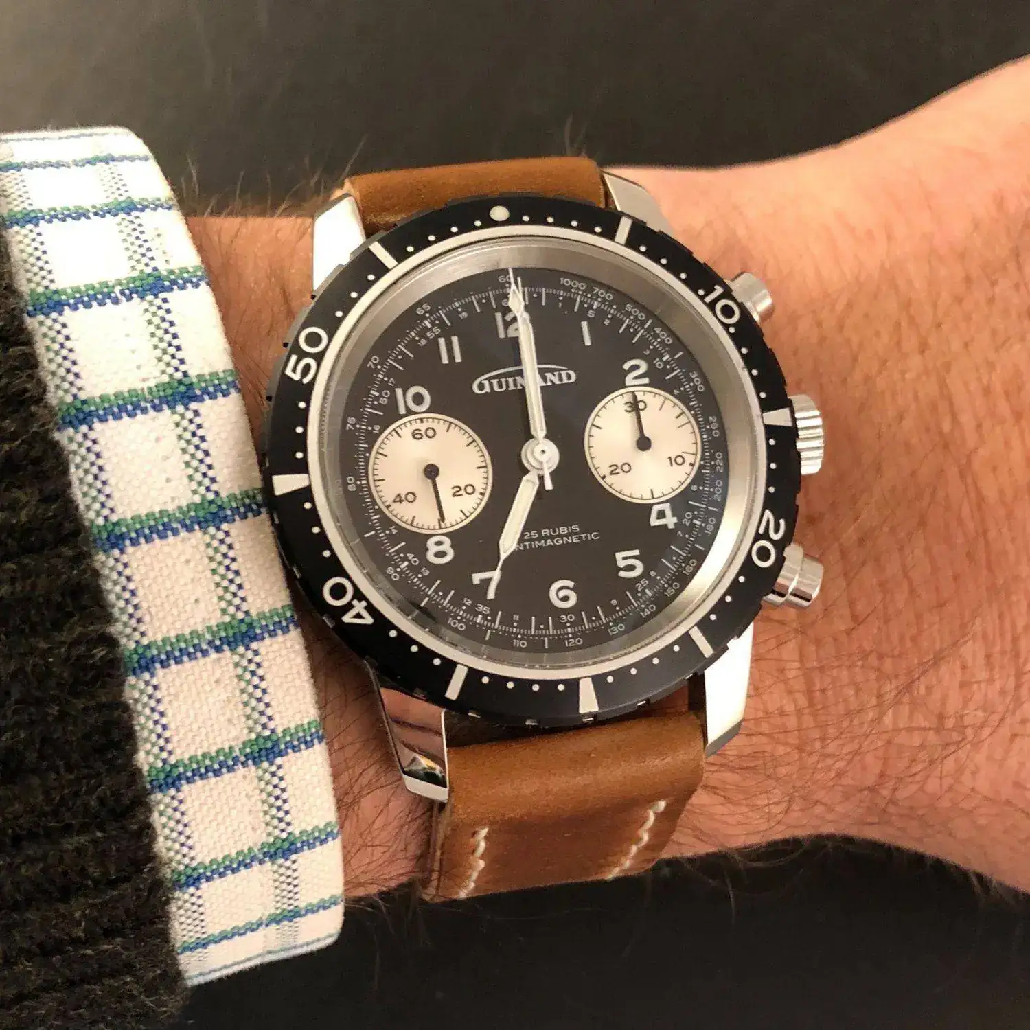 Buscando me encuentro con este cruce de pilot y diver de la marca alemana q creo q no se ha asomado por aquí (salió a finales del 2020). Me encaja mucho su estética y tamaño (salvo el grosor q está al límite en sus 14.5mm debido a su caja con protección antimagnética). Lleva un sellita dentro (igual q sus primos Sinn y B&R) pero cuesta con armis 1.600eur (casi 1.000 euros menos q el B&R). Lo único malo es no poder probarselo pues no lo distribuyen en España y hay q comprarlo online directamente a la propia Guinand. Un saludo a todos.