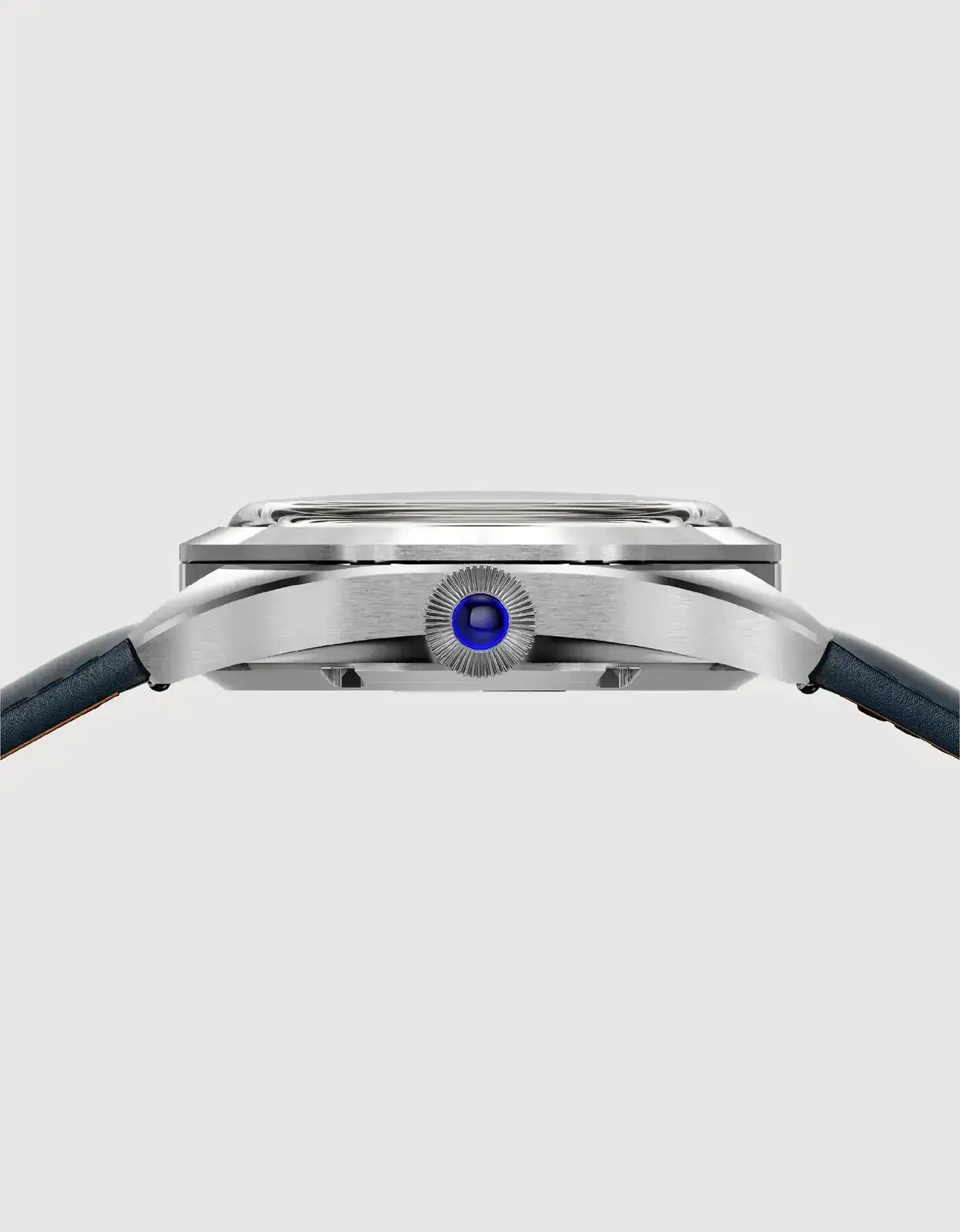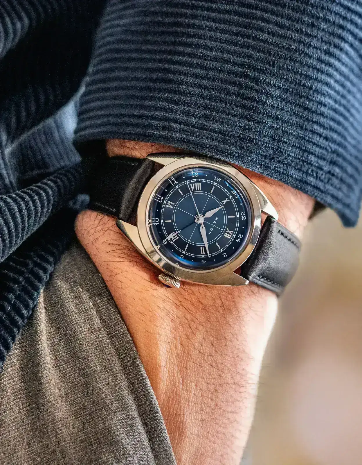 Los canadienses Héron, han presentado el modelo Mirabel GMT. Se trata de un reloj cuya propuesta es un GMT más formal o de vestir que los habituales. Aunque no soy de numerales romanos (solo en diales california), me resulta muy atractiva la manera en que lo han resuelto con esos números romanos e índices aplicados en negro sobre el fondo de enamel blanco. Además las agujas azuladas al fuego contrastan con el blanco y el negro dándole un aspecto realmente llamativo.