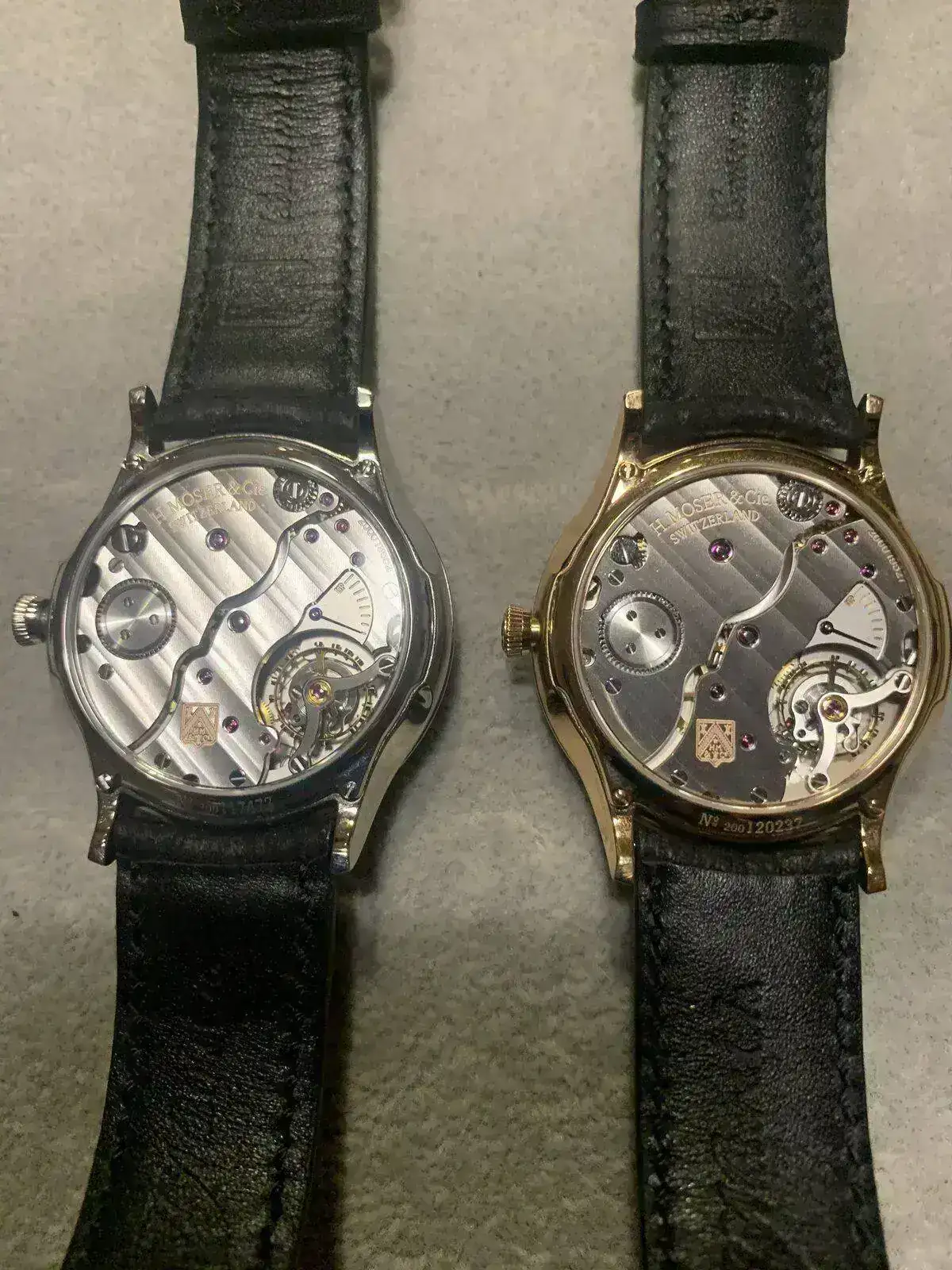 En su interior se aloja el calibre HMC 327, uno de esos bellísimos calibres de Alta Relojería de cuerda manual característico de H. Moser. Con únicamente el extra de una reserva de marcha de tres días vista en la trasera, escenifica claramente la importancia dada en el reloj a la profunda oscuridad en su estética. Animo a cualquiera a que se pase por el distribuidor a observar esta esplendida creación, que surgió prácticamente como una casualidad. Realmente merece la pena el poder verlo en vivo. Os dejo fotos de las esferas y calibres de los relojes, pero que ni de lejos representan su verdadera imagen.