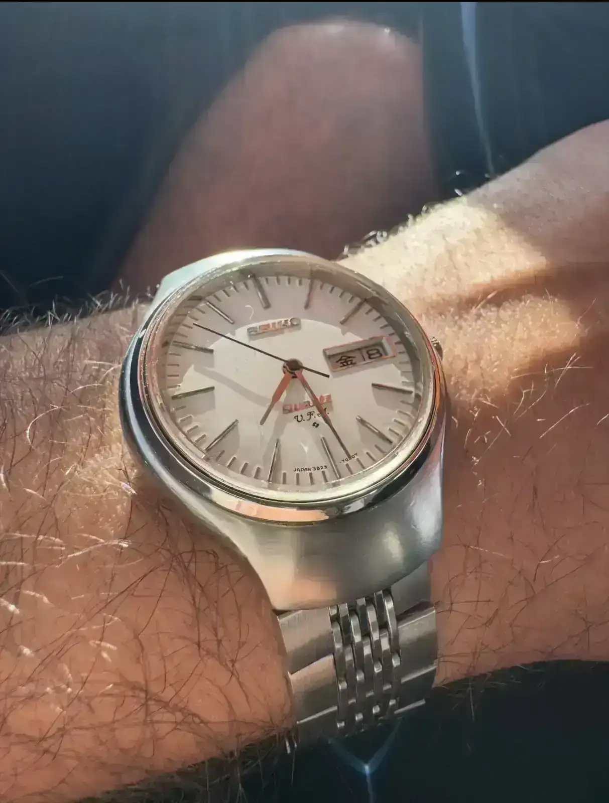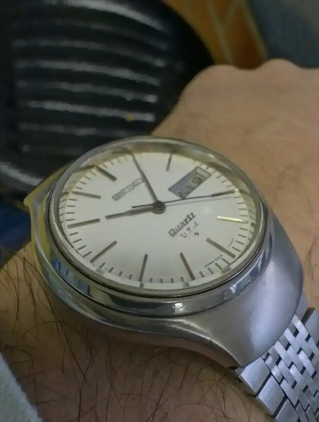- Seiko 3823-7000 VFA, caja “Helmet” y brazalete original. Considerado por muchos el mejor movimiento de cuarzo vintage de la historia de Seiko. El reloj va para 55 años y me gustaría que vierais cómo clava el segundo. Un reloj simple que valía en su época lo que un Toyota Corolla y con una precisión que, a día de hoy, es sencillamente increíble.