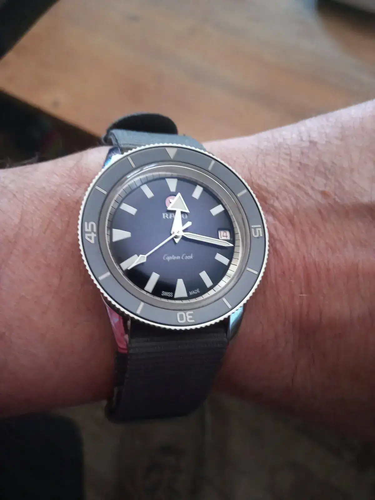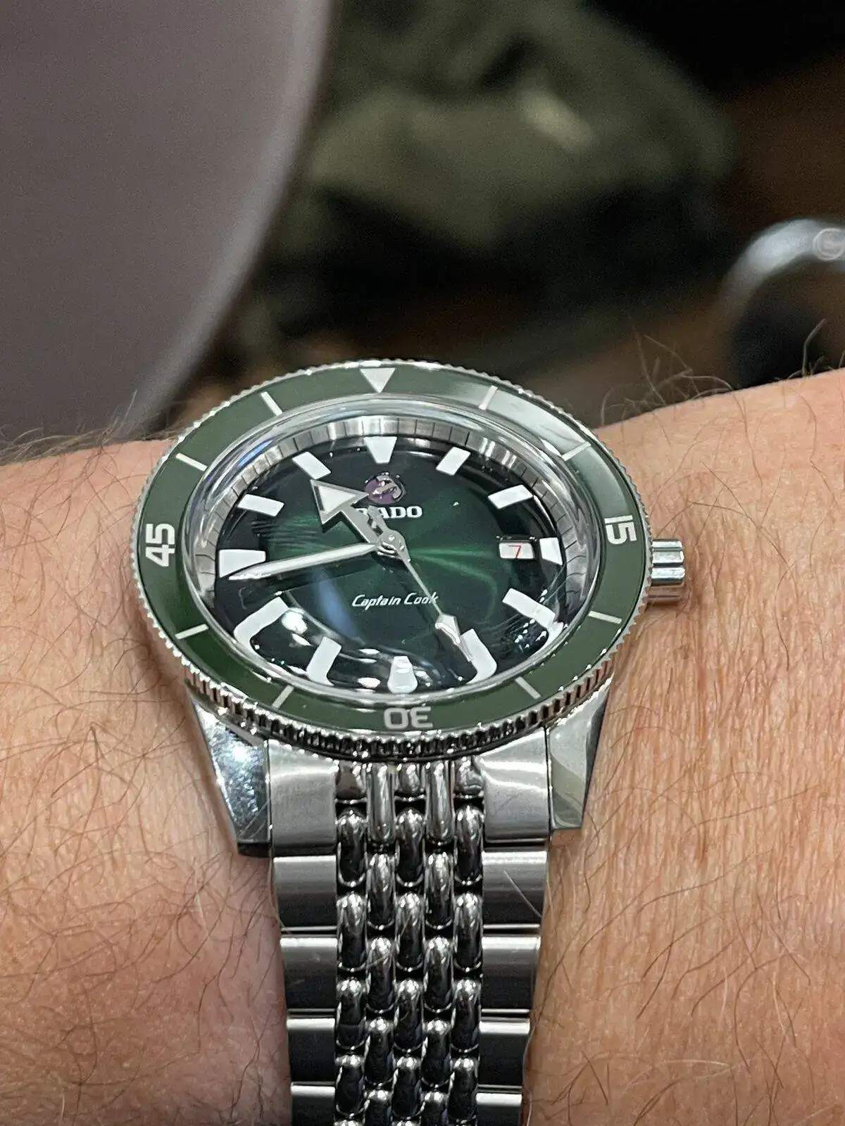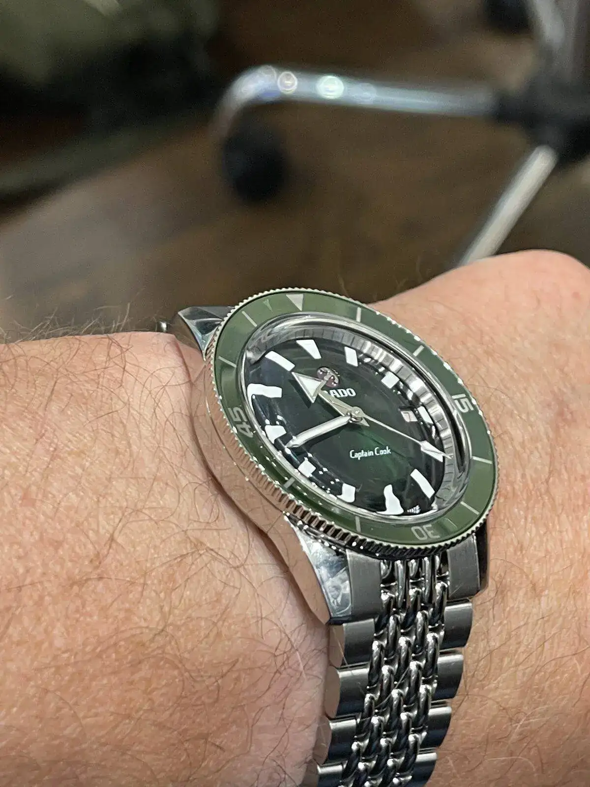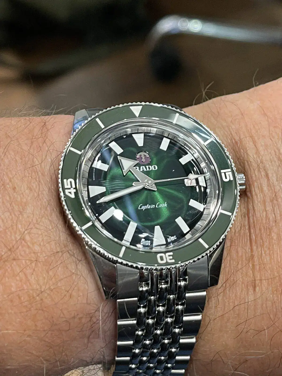 Pues hoy he podido probarme este bonito reloj, el Rado Captain Cook en esfera verde, 42 mm con armis grabó de arroz, en muñeca muy comodo dado su escaso grosor, datos técnicos los desconozco, como no lo iba a comprar no he profundizado más pero es una seria opción a quien busque un diver “asequible” dentro del mercado, su pvp es de 2050€ un precio que aún sin mediar descuentos lo veo muy interesante, aquí una foto para ilustrar