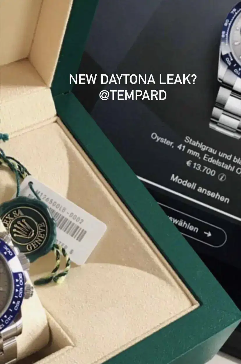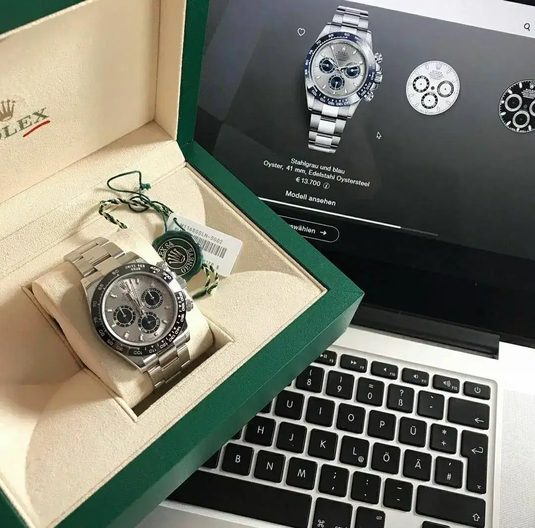 Creo que el Daytona que aparece en la caja solo se vende con Oysterflex y su referencia es 116519LN por lo que tampoco coincide con la etiqueta del reloj de la cajaEn tal caso seria fake solo el del portátil, el que sale en caja es real.
