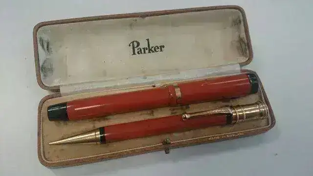 Para terminar, que no los últimos, por desgracia, este conjunto de Pelikan MK30, con su estuche original, que además de ser un conjunto, encima lleva un grabado personal en la capucha metálica. En este caso, por lo que costaba y con dicha tara, no tenía excusa para rechazarlo. Siempre es disculpable el egocentrismo de los propietarios que hacen personalizar sus instrumentos de escritura o sus calzoncillos, pues bastante castigo tienen con ver desde el más allá como su nombre es sobado por otros por toda la eternidad (en los instrumentos de escritura, se entiende, ya que la ropa interior es menos duradera).