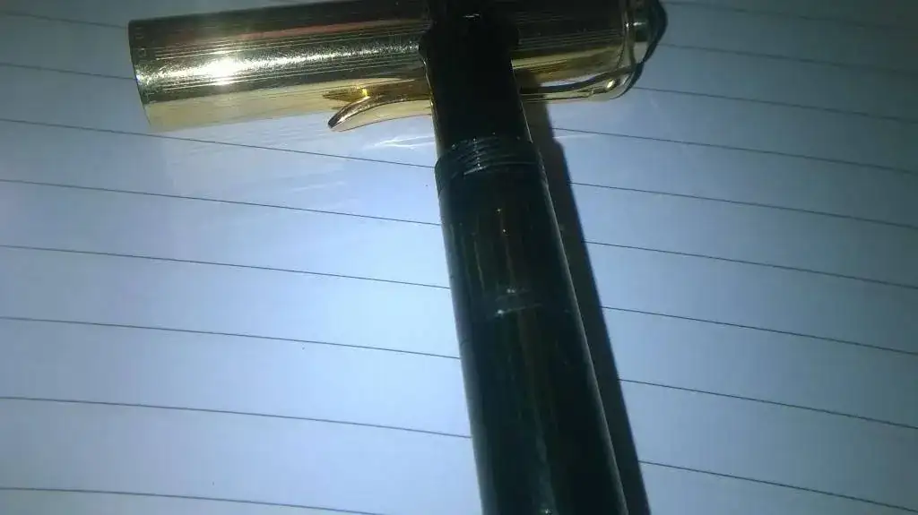 Se trata de una Pelikan 500NN, de los años 50. Carga por émbolo, capuchón roscado de oro chapado, "Rolled Gold Double L +" y plumín semiflexible,de oro de 14k, creo que punto fino. Después de una pequeña limpieza y carga, ha quedado así, aunque debo pulir algo el cuerpo, ya que no se ve bien el detalle.. Espero que os guste: