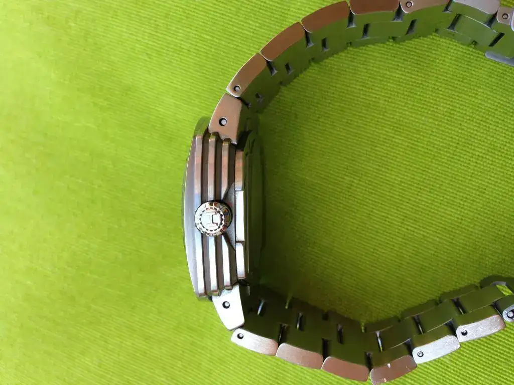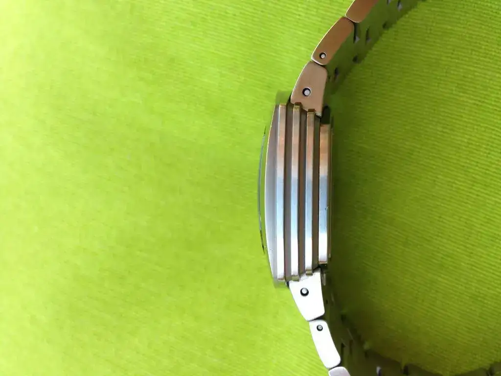 - El bisel de la caja tiene un pequeño “toque” (un puntito) casi imperceptible y que sólo se ve dependiendo de la luz (hacia las tres). Pueden verse también, dependiendo de la luz, algunas rayas absolutamente superficiales y que no he podido fotografiar. En el lateral contrario a la corona también hay dos “puntitos”. En el resto de la caja no veo nada. El cristal de zafiro está perfecto.