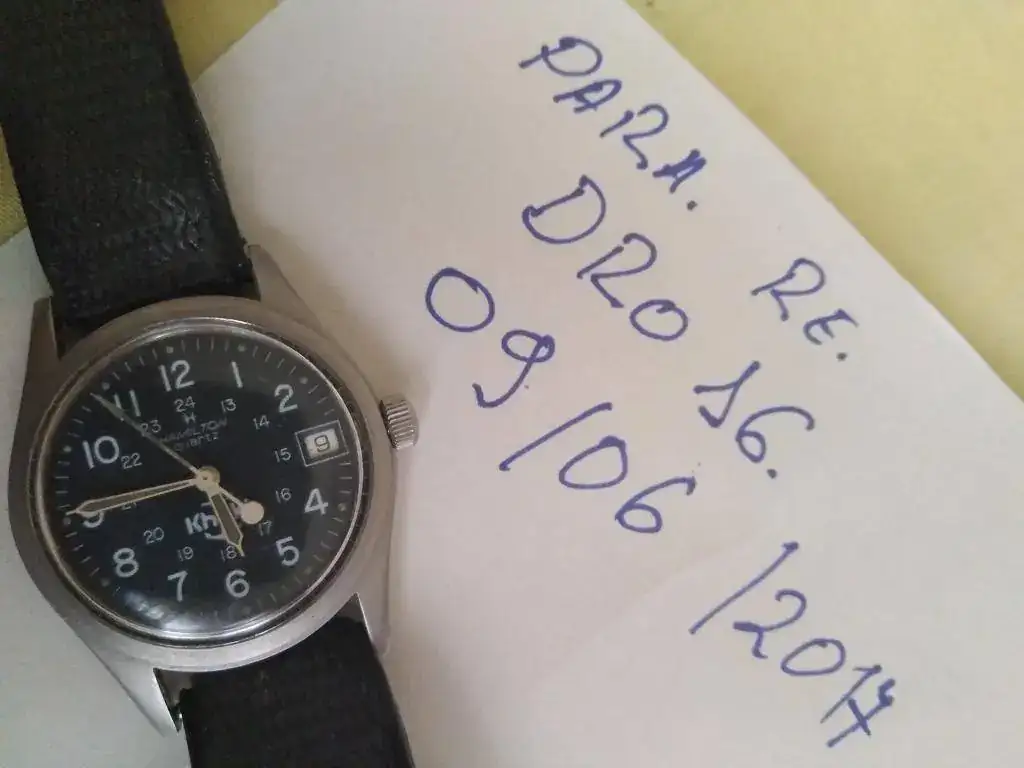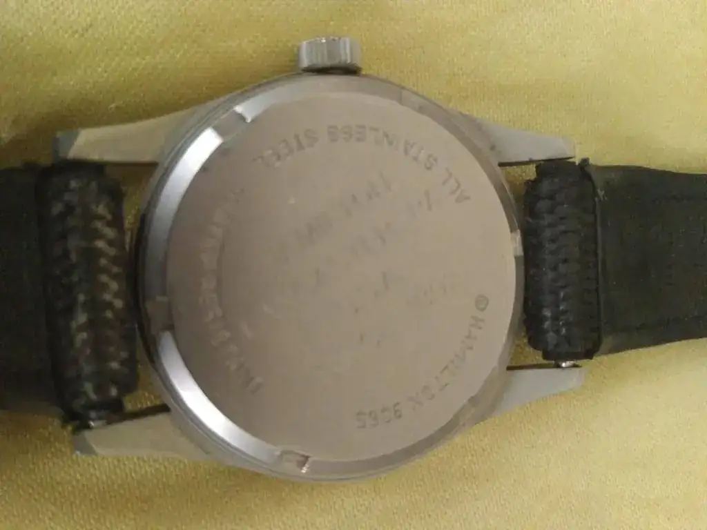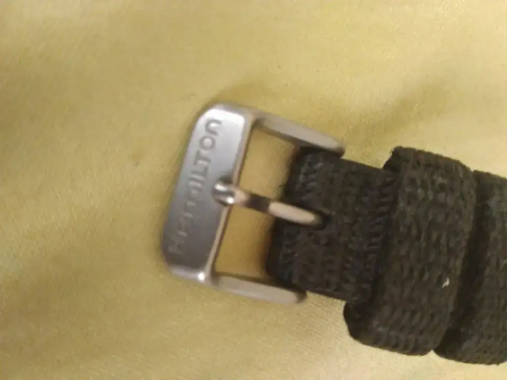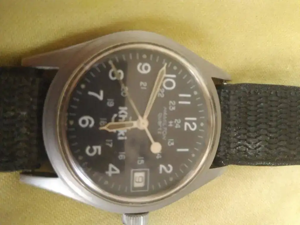 Ofrezco este Hamilton de cuarzo con correa, hebilla originales, y el lumen de las manecillas con un precioso tono tostado: