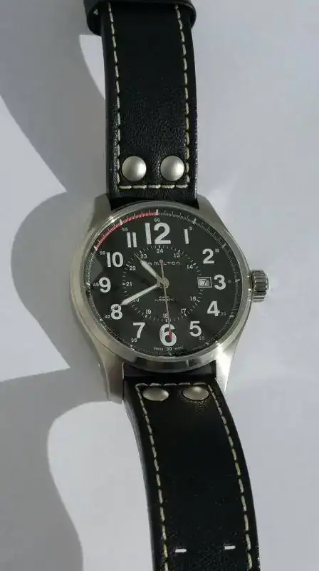 Saco a la venta este precioso Hamilton automático, en un estado de reestreno, tiene cuatro o cinco puestas en sus dos meses de vida, su estado es de 99% sobre 100%(por que esta usado), no tiene ni marcas ni roces ni golpes, la correa está en perfecto estado como se aprecia en las fotos de interior y exterior. El motivo de la venta es siempre el mismo para unos entren otros deben salir. Esta vez no estoy interesado en cambios.