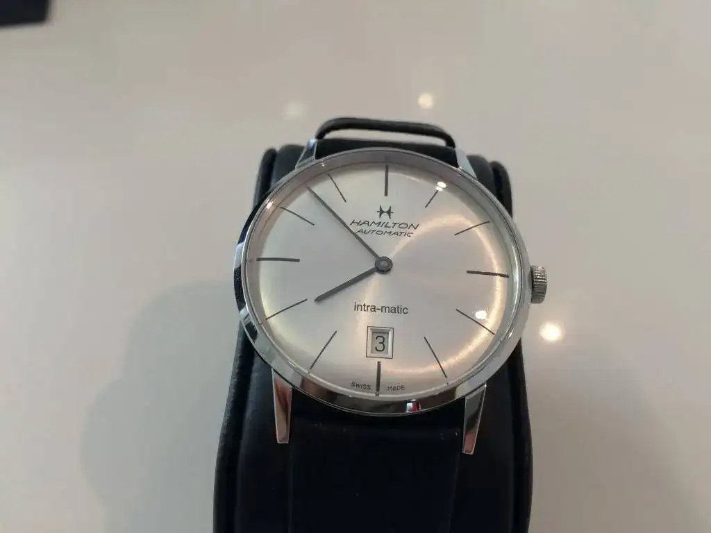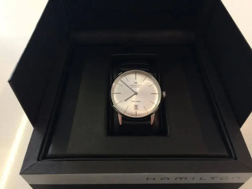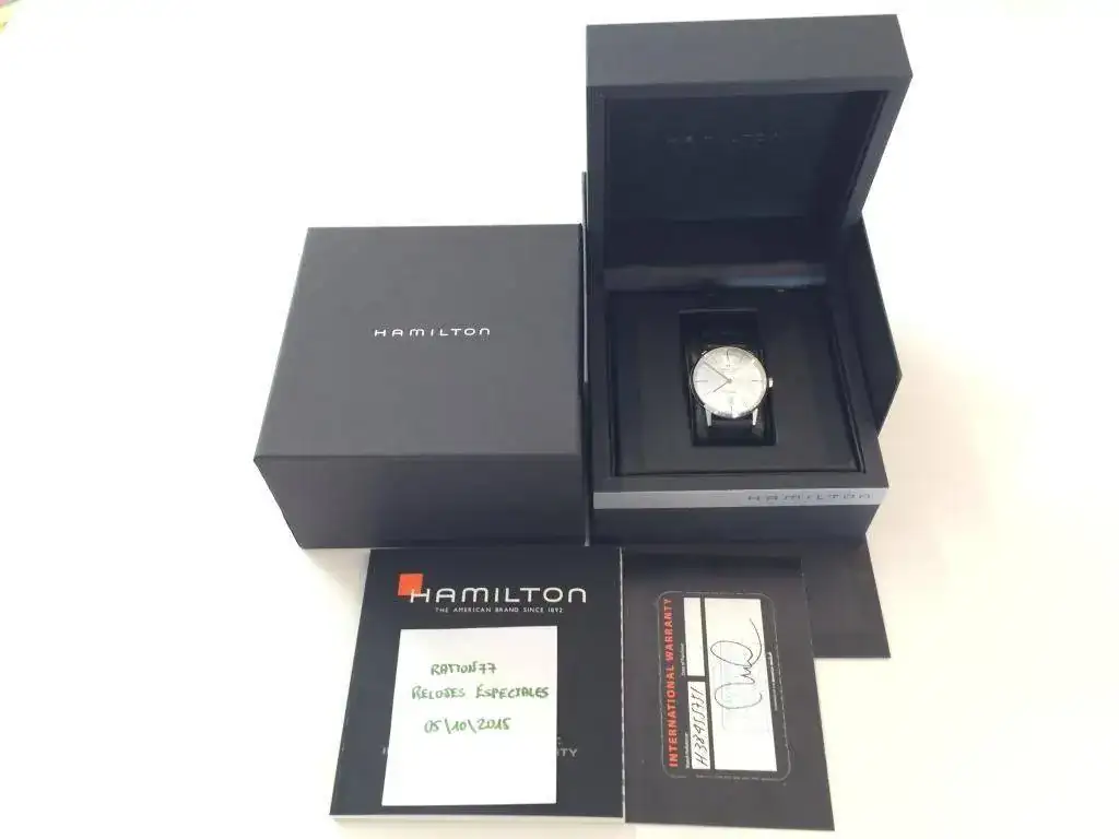 Saco a la venta en el foro un hamilton intramatic de 38 mm, el de la esfera plateada. Comprado por mí en relojería en Valencia en Mayo/Junio 2014 (no lo recuerdo exactamente y la tarjeta viene sellada pero sin fecha, así que no puedo dar más precisión, ya que aporto este dato de cabeza). No ha estado en más muñeca que en la mía.
