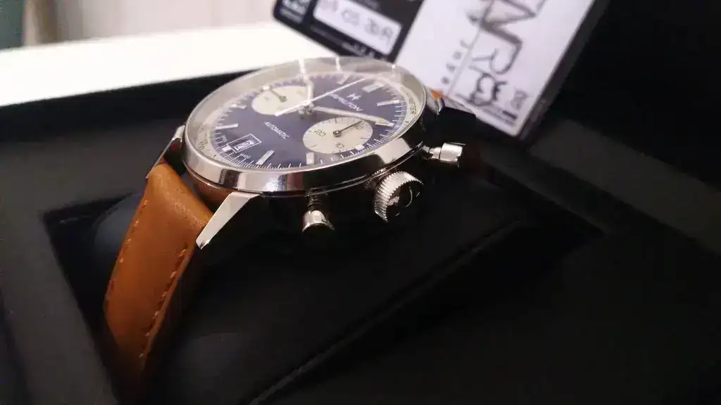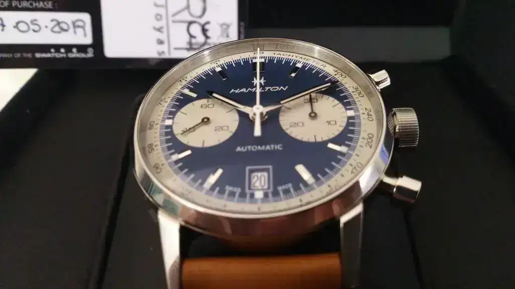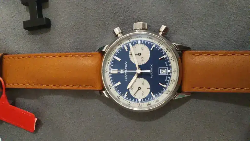 Saco a la venta este reloj HAMILTON modelo Intra-matic Auto Chrono, en su versión de esfera azul y correa de cuero color cámel, la gran novedad de Hamilton en el 2019.