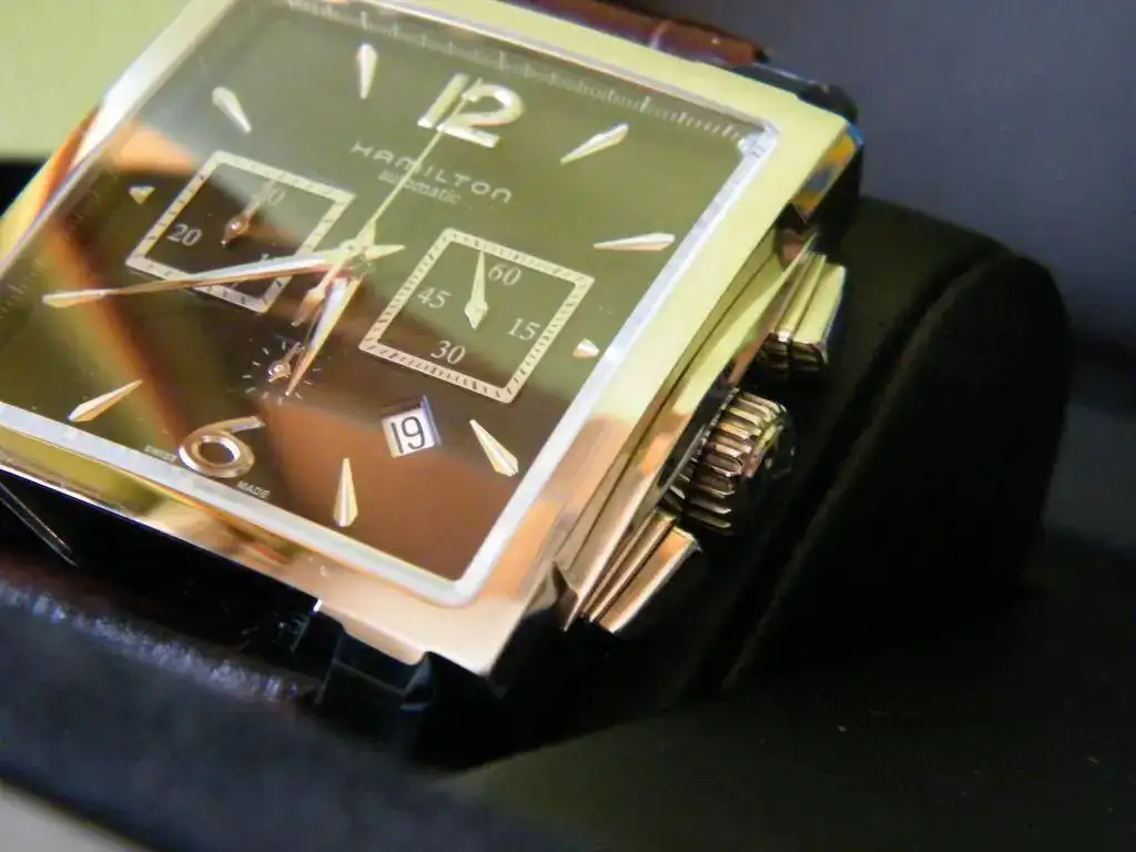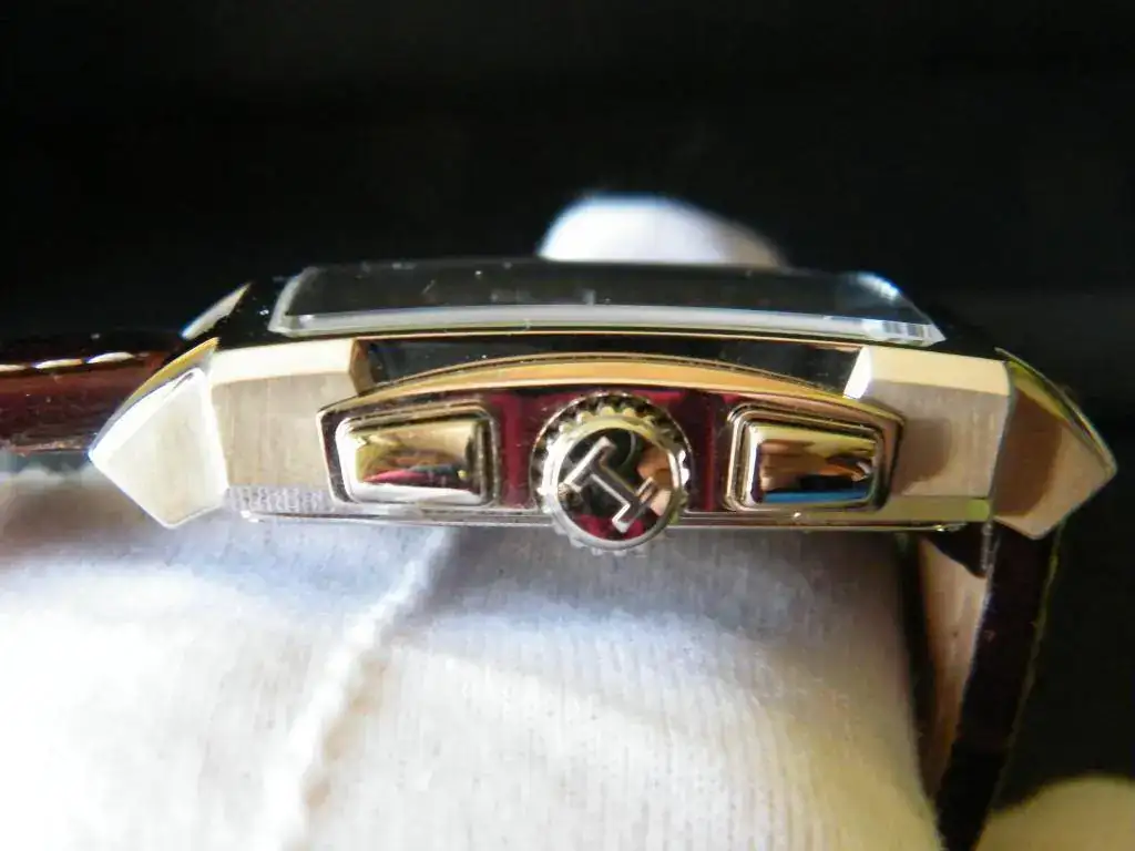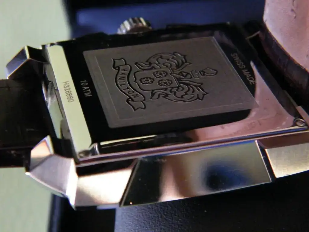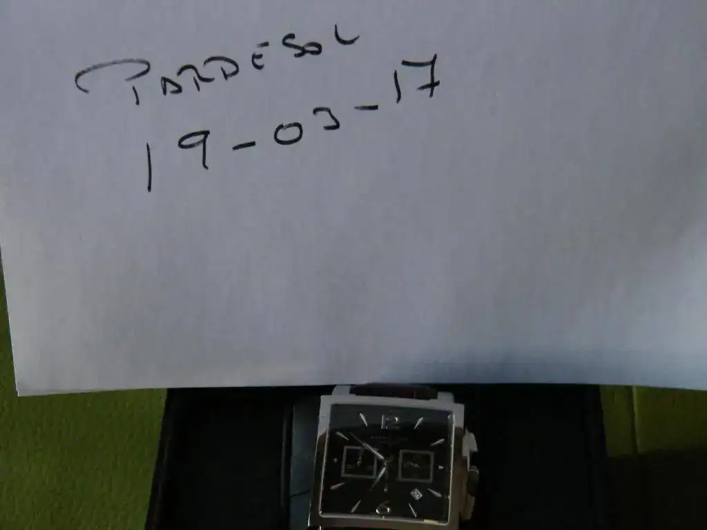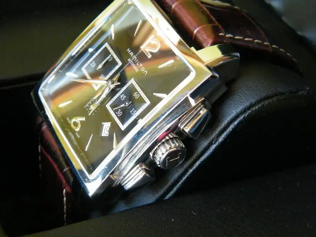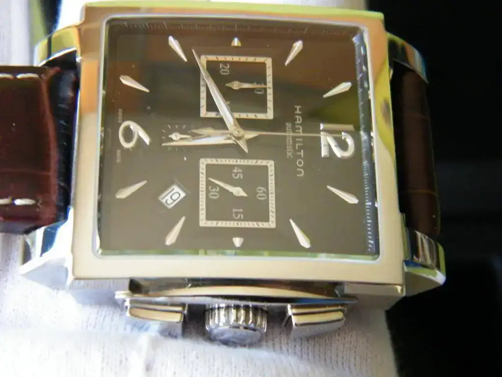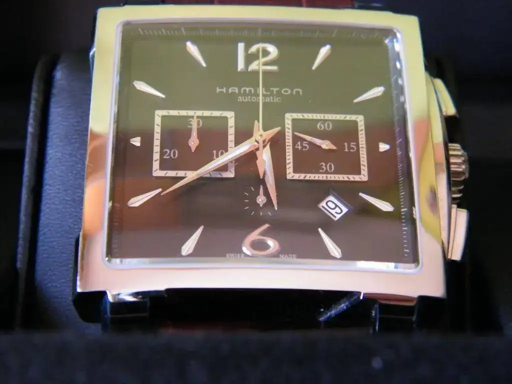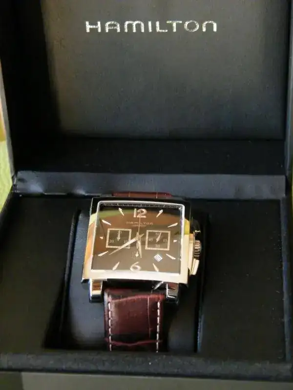 Vendo este Hamilton cronógrafo automático rectangular de gran tamaño 41x41 esfera negra con tres contadores y fecha en ventana a las 4.30 h . Se trata del Jazzmaster conocido también como Mónaco, monta el calibre ETA 7750 con un estanqueidad de 100 m. Su estado es verdaderamente impecable, lo entrego con su caja sin papeles.