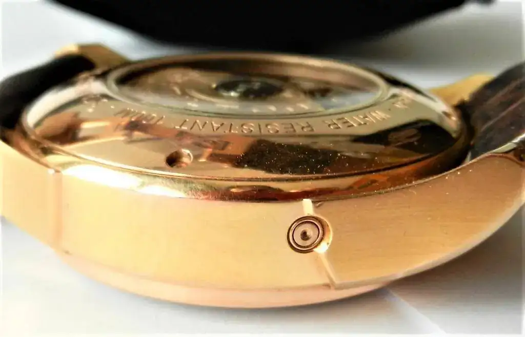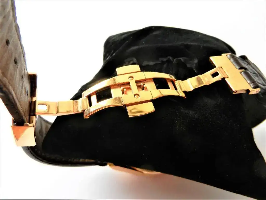 Material / Color de la caja (anterior y posterior) , biseles, hebilla: Acero inoxidable chapado en Oro Rosa de 18 Ktes