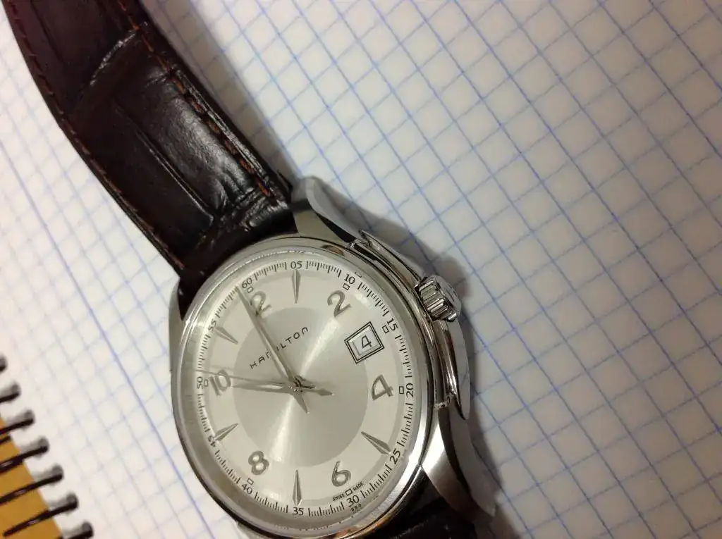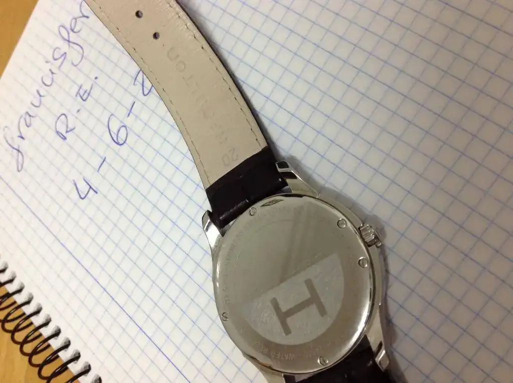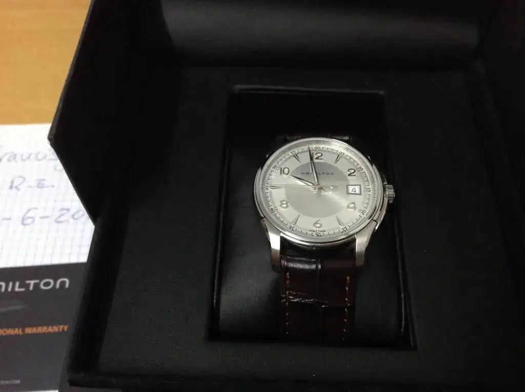 Es el modelo de 38 mm, cuarzo ETA, esfera plata con texturas, luminova, cristal zafiro impoluto, correa de piel acabado coco original Hamilton con hebilla original, cajas exterior e interior.