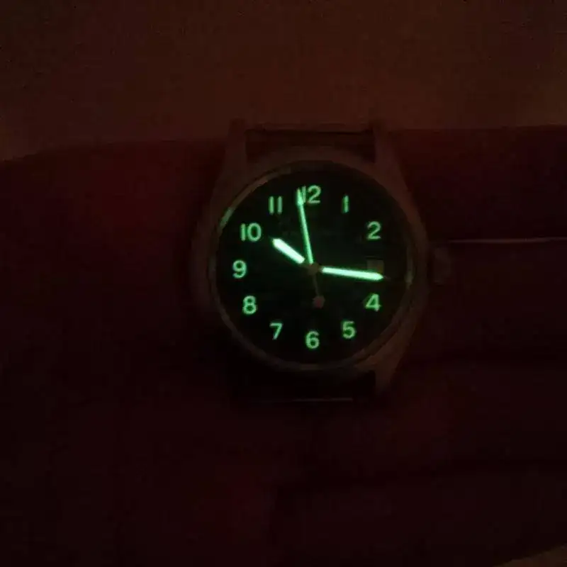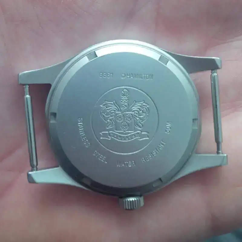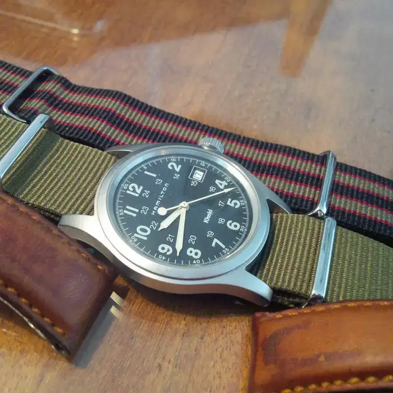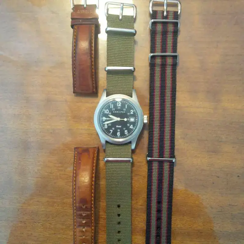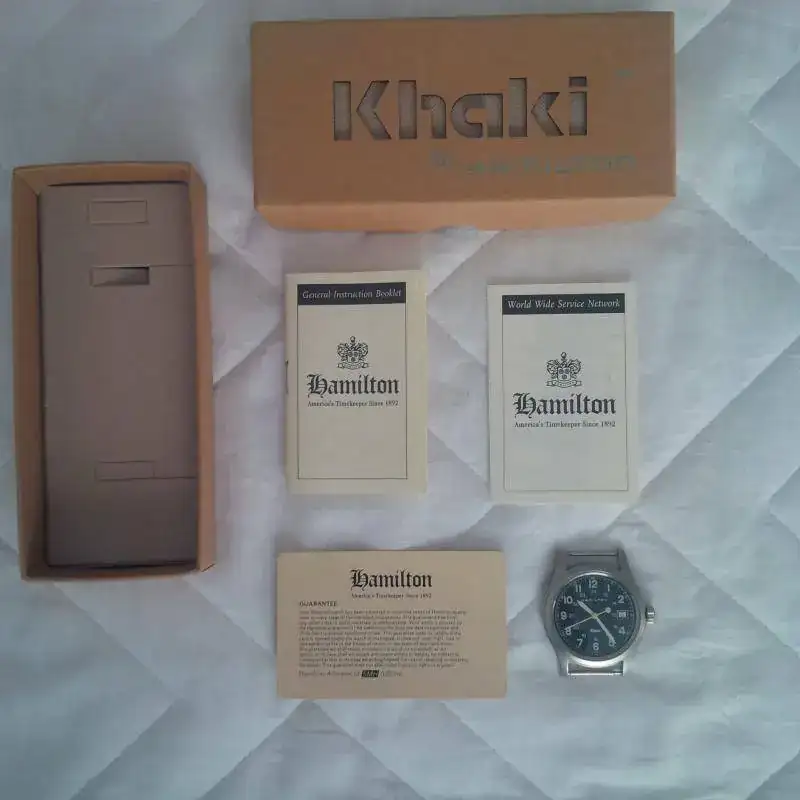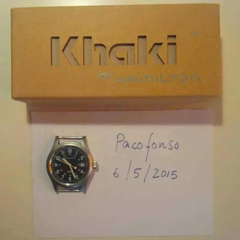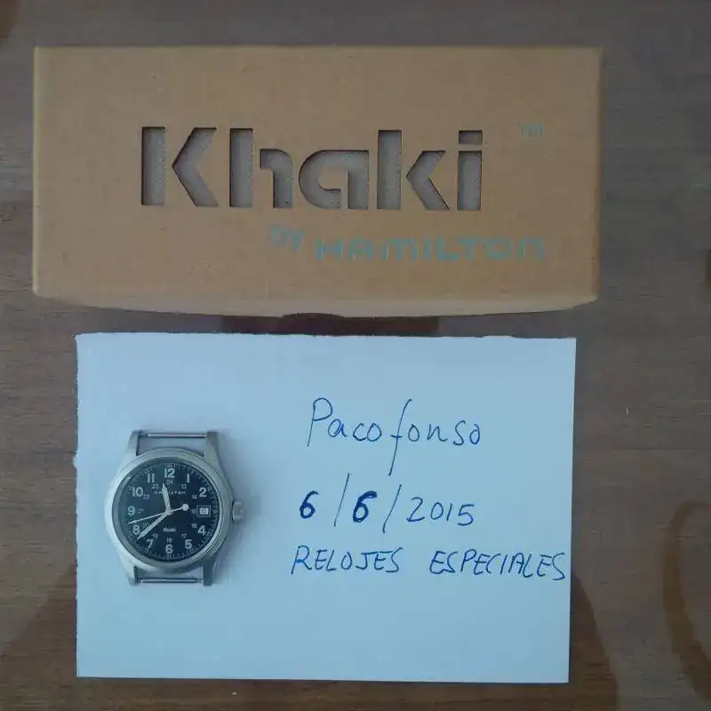 con el permiso del foro saco a la venta este Hamilton Khaki de cuarzo. El reloj es del año 2001, tiene sus años a la espalda y presenta claras marcas de uso. Especialmente el cristal, que está rayado, como se ve en una de las fotos, aunque no es exagerado. Por lo demás se encuentra funcionando perfectamente. Cambio de pila en el corte ingles en 2013, creo que a principios, y también se le hizo la estanqueidad. Va acompañado de la correa de cuero que se ve en la foto, que venía con el reloj y está usada aunque le queda vida por delante, y las dos NATO, la verde muy poco usada y la bond puesta dos veces y prácticamente nueva. Cuarzo no se desvía nada y sobre todo el lumen sigue siendo muy muy bueno, tanto por la intensidad con la que brilla como por lo que dura. El reloj viene en su caja original (foto) con la documentación que venía. Garantía acabada. Envío por mensajero MRW. Creo que no se me olvida nada, cualquier pregunta o duda por privado. Gracias a todos por leer y al foro por el espacio