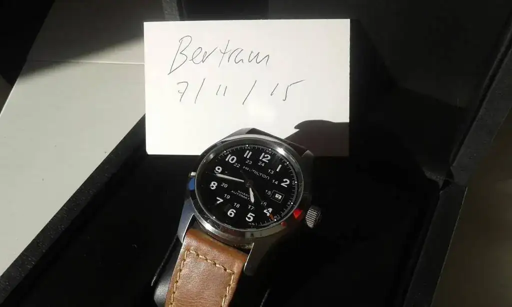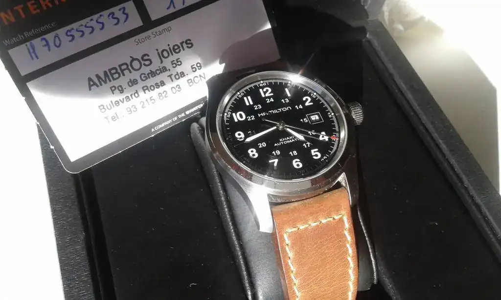 Lo uso menos de lo que pensaba, entran piezas importantes y toca hacer algo de caja. Ese es el motivo de la venta de este precioso clásico de tamaño actualizado y perfecto, y que tiene sus principales defectos corregidos, el antireflejos, un verdadero desastre en estas gamas de Hamilton y la correa original, decente pero muy sosa. Ahora lleva un zafiro con AR bastante bueno (las fotos están hechas con un tel. malo y con luz solar directa para que se aprecie el trabajo del AR) y una preciosa correa artesanal con un toque ligeramente vintage que le queda de cine sin alterar su estética original. En definitiva, pasamos de un reloj de 575 Euros a uno de 900 por prestaciones y estética.